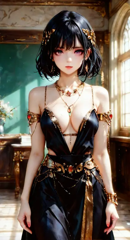 プロンプトワード: sexy-black-dress, bracelet, black dress, necklace, dress, armlet, cleavage, bare shoulders, long skirt