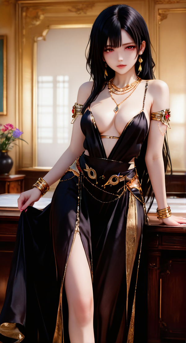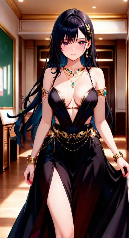 提示词:sexy-black-dress、手镯、黑色连衣裙、项链、连衣裙、臂环、乳沟、露肩、长裙
