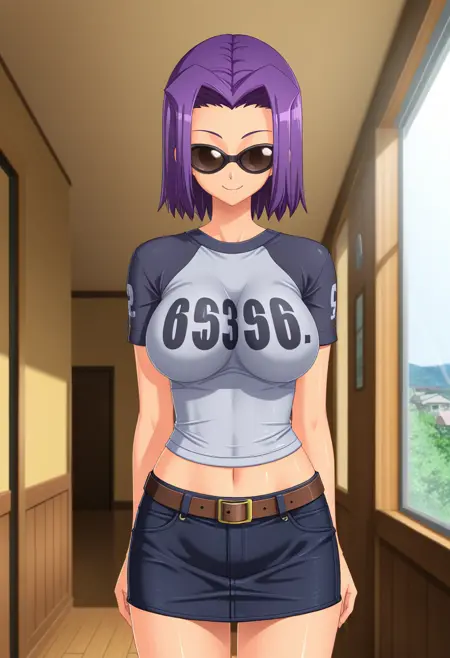 - pieceww, sunglasses, purple hair, medium hair, hair intakes, parted bangs, large breasts,