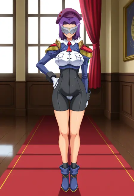 a-piece moon costume, black bodysuit, beret, epaulettes, thighs, bare legs,