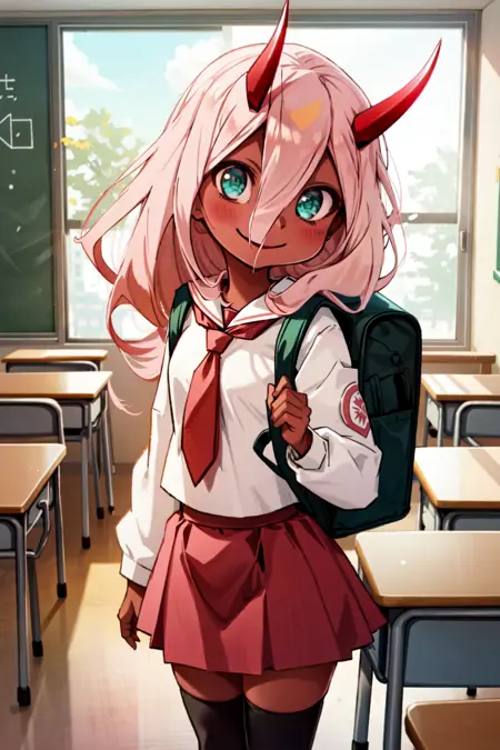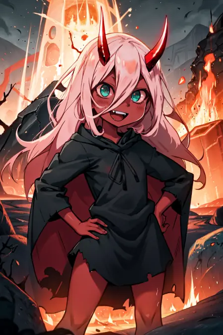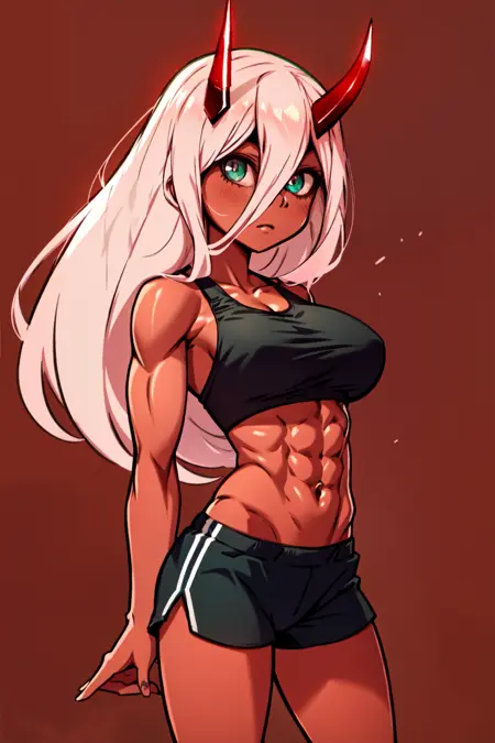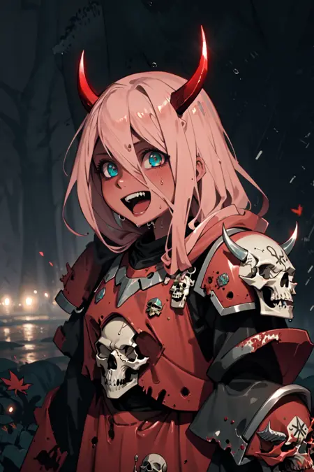 Prompts are : Zero Two, 1girl, long hair, (red skin), red horns, pink hair, green eyes, colored sclera