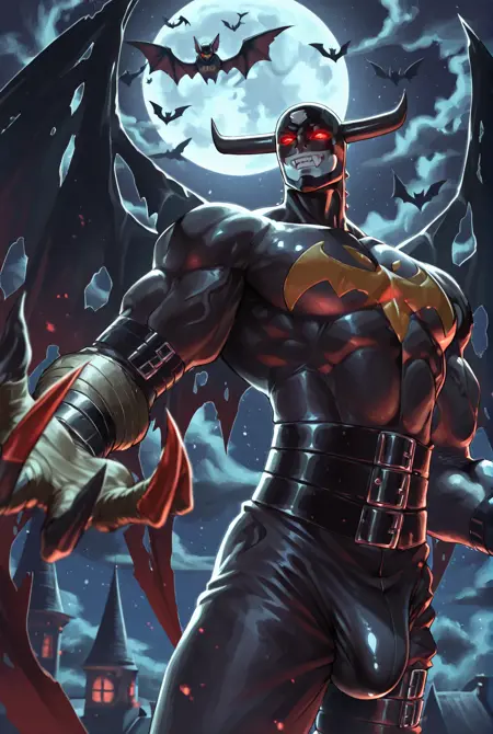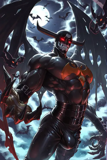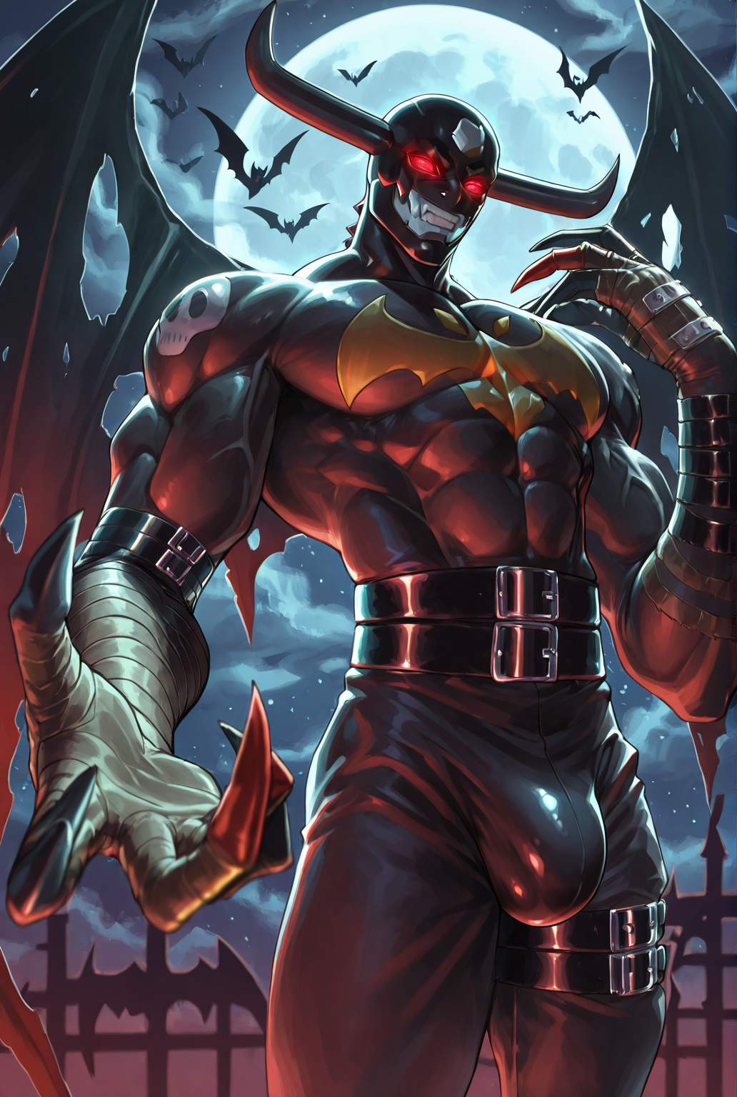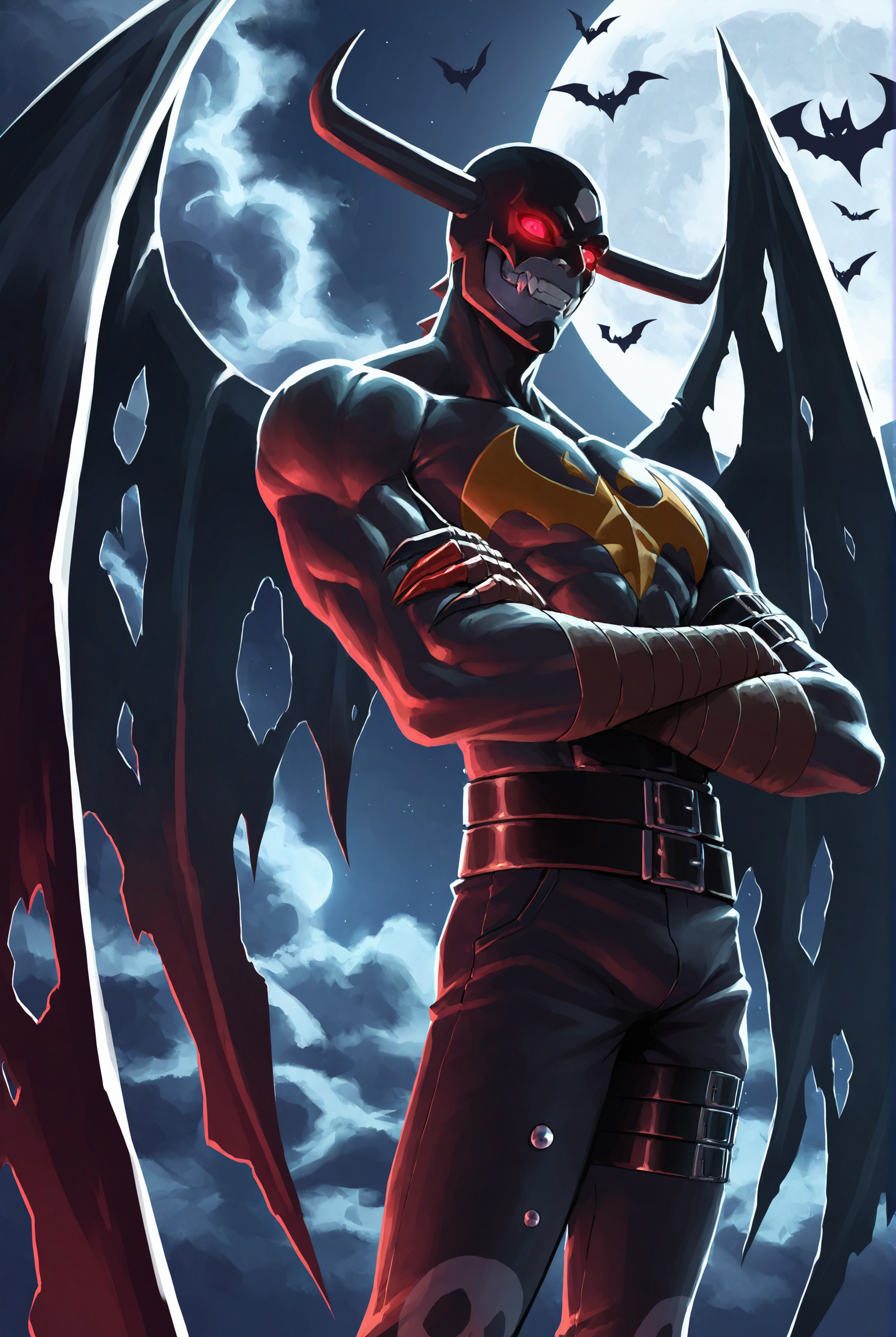 devim0n, digimon, long arms, claws, horns, belt, red eyes, demon wings, wings, teeth, mask, glowing eyes