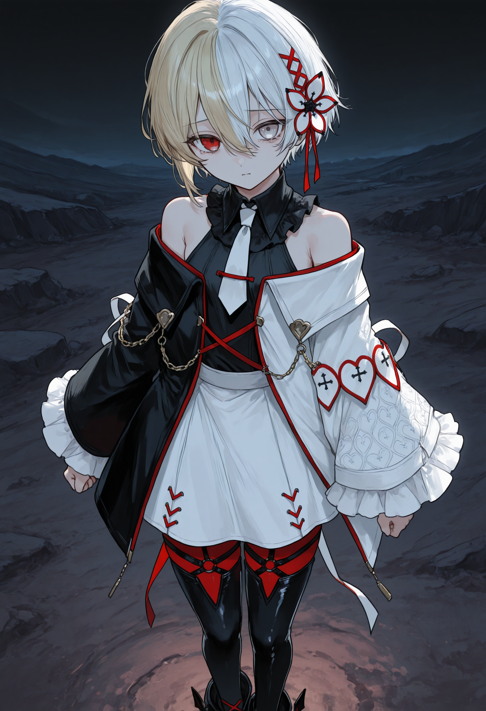 vita wanderer, short hair, hair ribbon, hair between eyes, black footwear, white hair, blonde hair, white hair ornament, single hair ornament, heterochromia, red eyes, grey eyes, white eyes, small breasts, off shoulder, bare shoulders, white necktie, black halterneck, dress, white dress, jacket, long sleeves, wide sleeves, frilled sleeves, asymmetrical sleeves, two-tone jacket, chain, jewelry, red pantyhose, black thighhighs, leather legwears, boots,