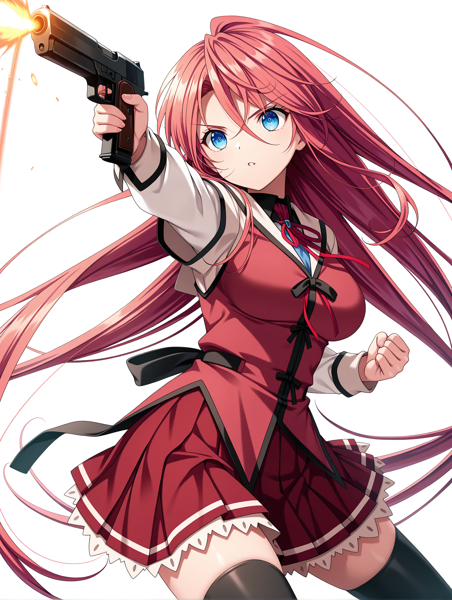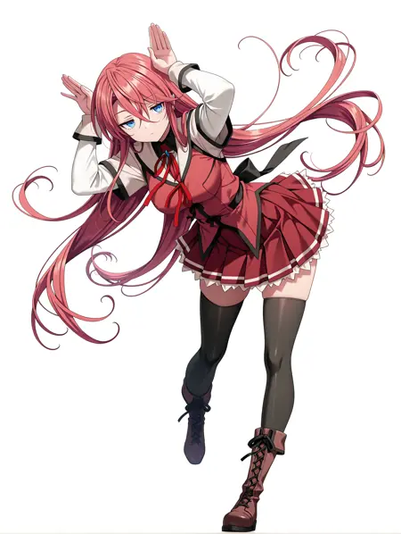 制服 ・t_clothes,long sleeves,ribbon,red skirt,pleated skirt,frilled skirt,black thighhighs,boots,