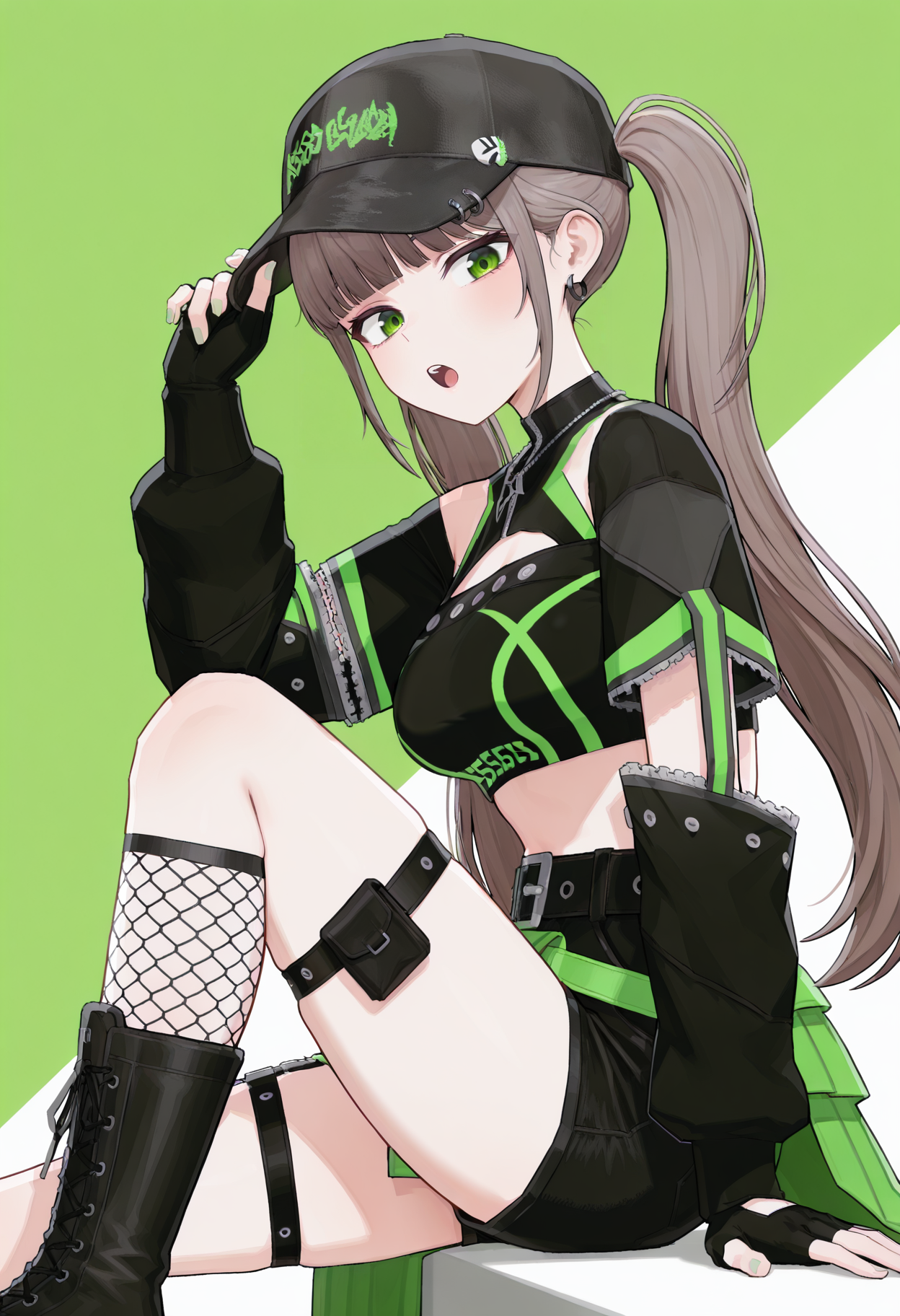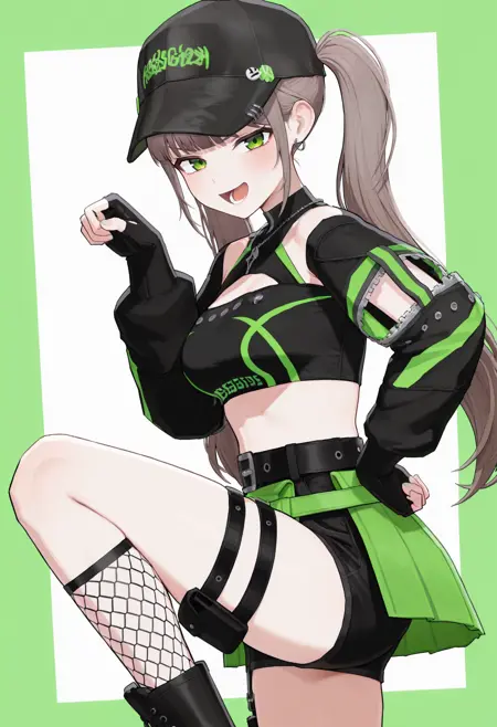 트루러버 비챤(Truelover VIichan): TRVII, brown hair, long hair, blunt bangs, twintails, hoop earrings, green eyes, black headwear, baseball cap, crop top, black shirt, multicolored shirt, star necklace, striped sleeves, clothing cutout, armpit cutout, zipper, fingerless gloves, glove cutout, black gloves, halterneck, belt, black shorts, green skirt, overskirt, thigh strap, thigh pouch, fishnet socks, kneehighs, black footwear, combat boots