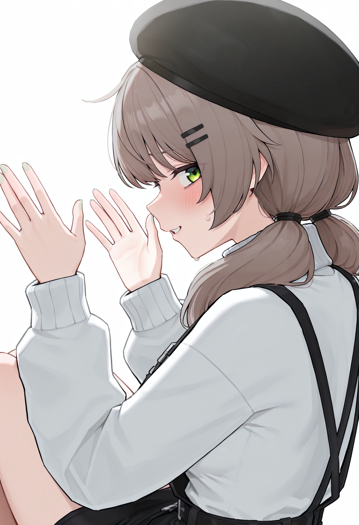기본의상 비챤(Basic VIichan):BSVII, brown hair, medium hair, low twintails, hairclip, hair tie, bangs, green eyes, black beret, heart necklace, white sweater, turtleneck sweater, long sleeves, black skirt, overall skirt, black belt, belt buckle