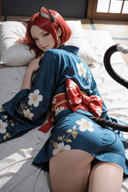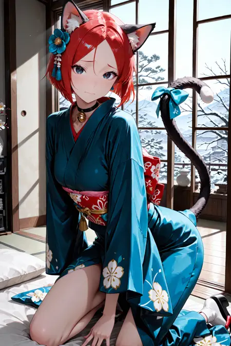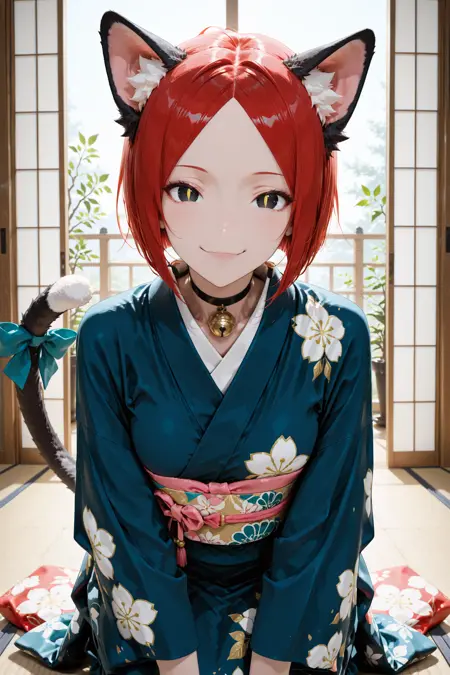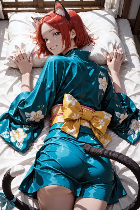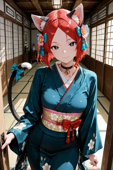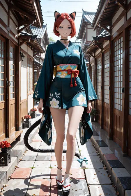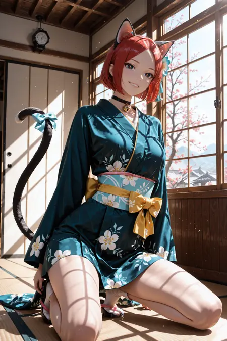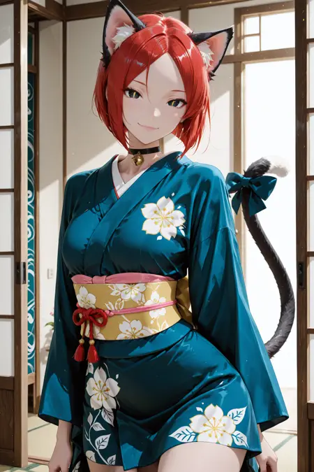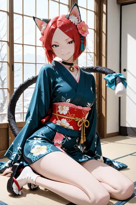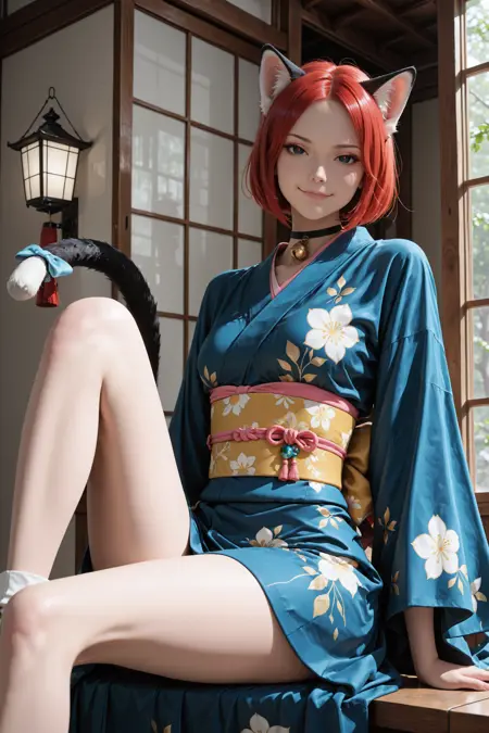 머리카락, 눈, 옷을 더 일관되게 얻고 싶다면 "빨간 머리, 검은 눈, 노란 동공, 세로 동공, 파란 기모노"라는 프롬프트를 추가하는 것을 추천합니다.