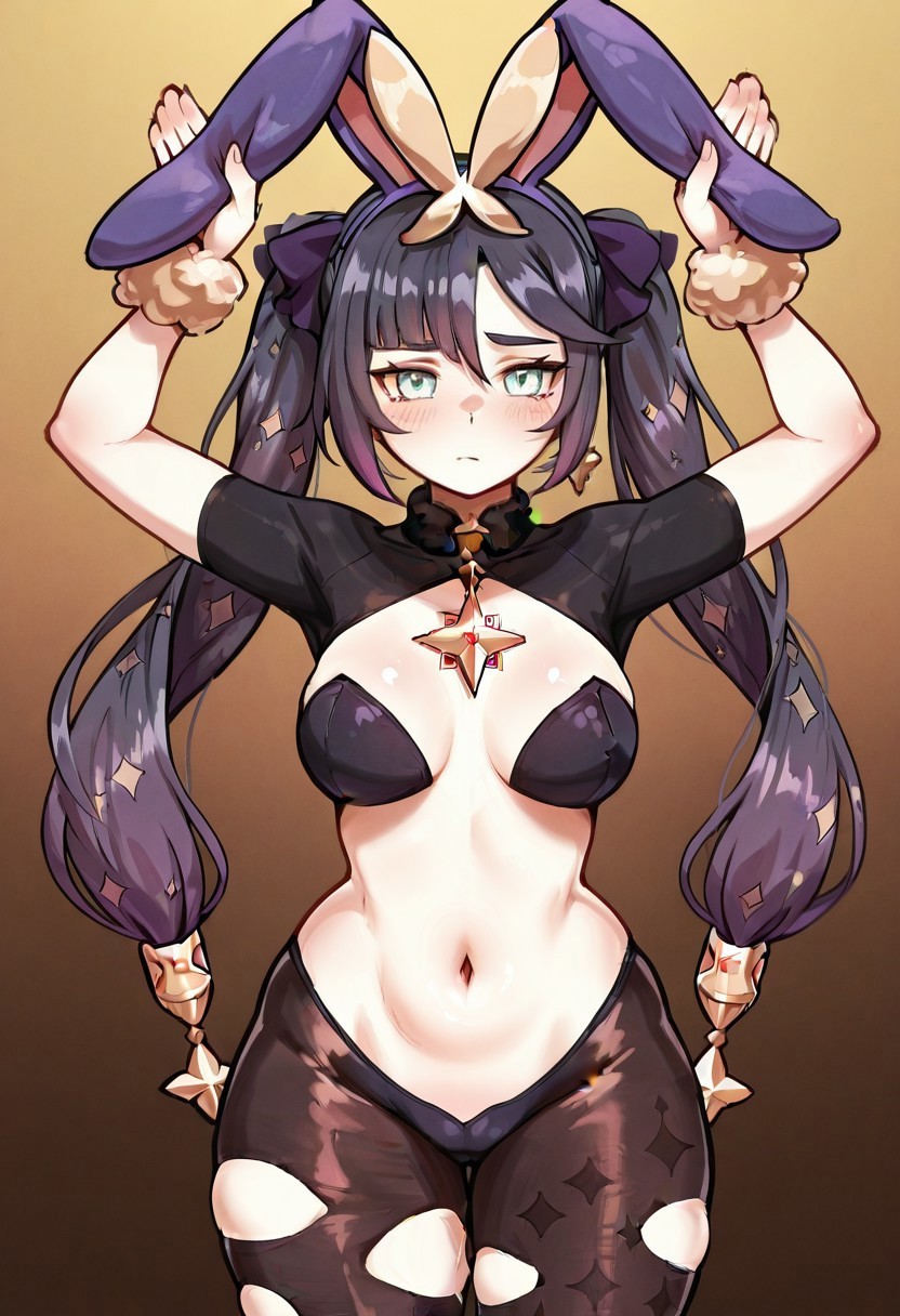 - 가짜 토끼 귀, 검정 상의, 검정 투명 스타킹, 찢어진 스타킹 - 묶은 머리, 더블 테일 - 하트 마에바리