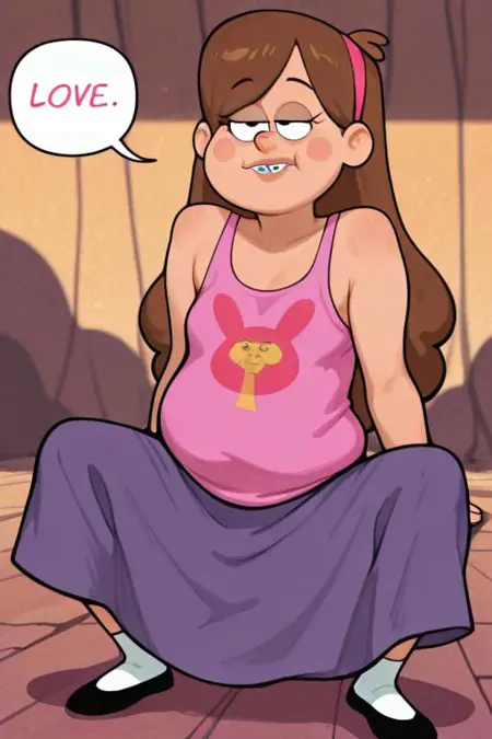 1 girl、メイベル・パインズ、茶色の髪、長い髪、頬のステッカー、ピンクのセーター、ピンクのヘアバンド、紫のスカート、白い靴下、黒い靴