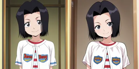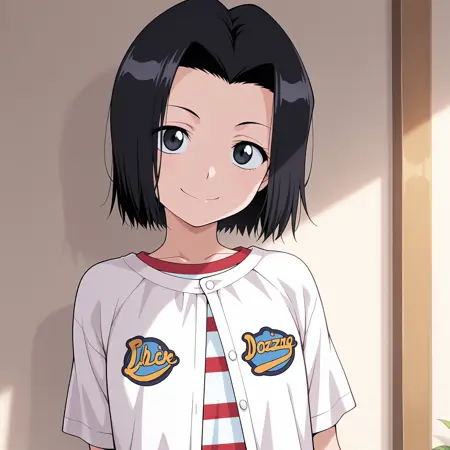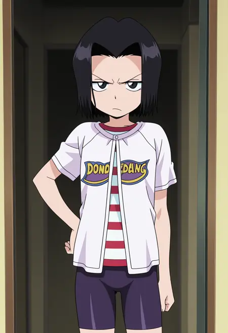 karin, 1girl, short hair, black eyes, black hair, parted bangs, flapper shirt, striped shirt, purple bike shorts,