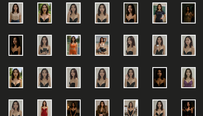 이 이미지에서 같은 소녀의 100장의 이미지가 다양한 자세, 조명, 표정 및 배경으로 생성되었으며, 최고 품질을 위해 이미지를 업스케일링했습니다.