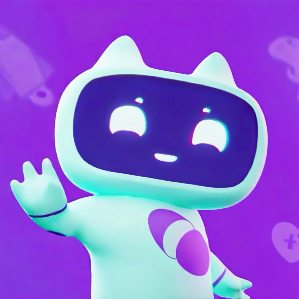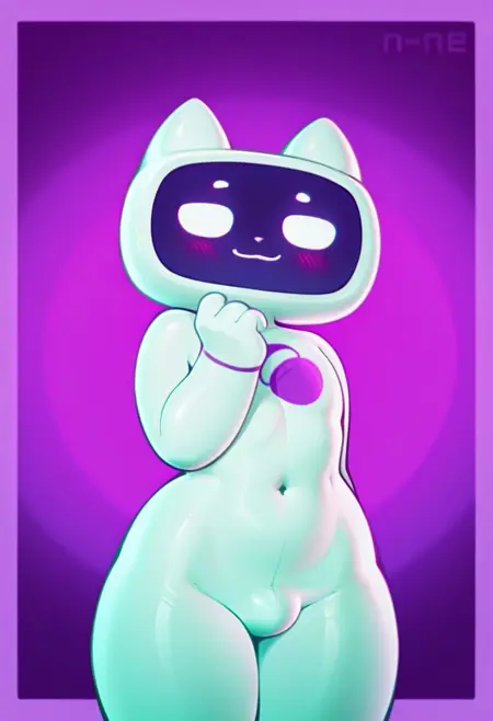 robot, cat robot, screen face, screen, glowing screen, cat ears, animal ears, white body, logo on chest, dot eyes