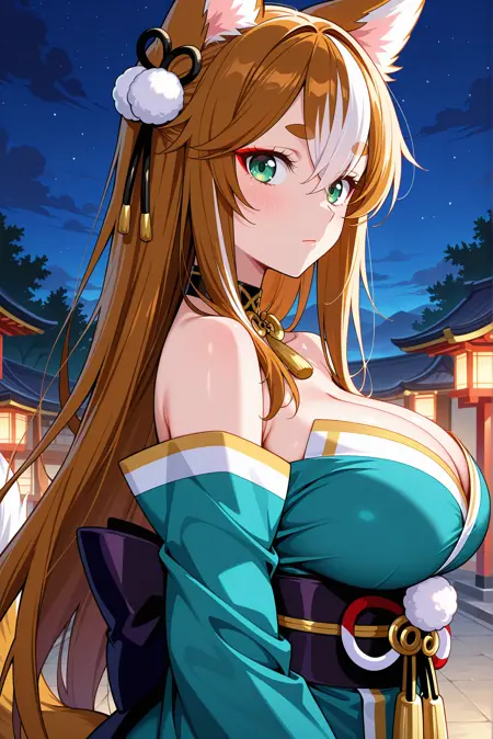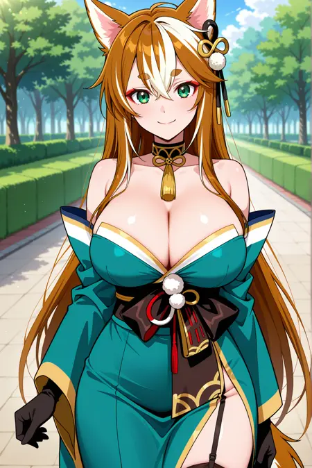 외모: 녹색 눈, 빨간 눈썹선, 갈색 머리, 여우 귀, 여우 꼬리, 스타일리시한 머리, 매우 긴 머리, 두꺼운 눈썹, 짧은 눈썹, 큰 가슴