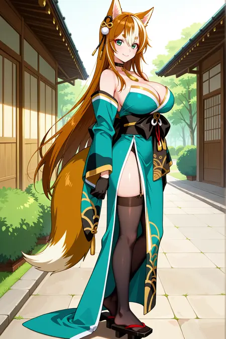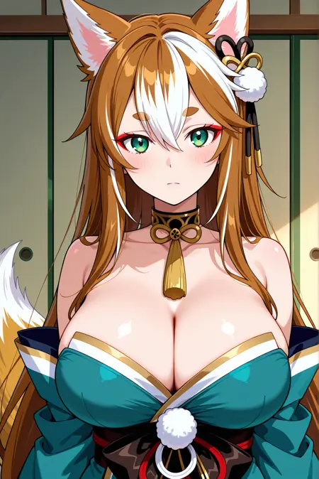 Appearance: green eyes, red eyeliner, brown hair, fox ears, fox tail, steaked hair, very long hair, thick eyebrows, short eyebrows, large breasts