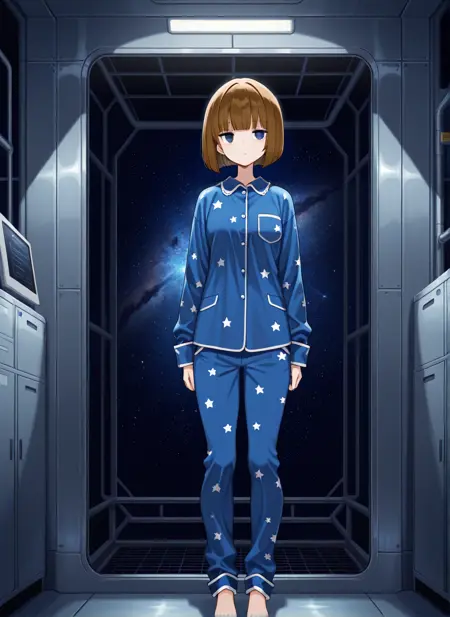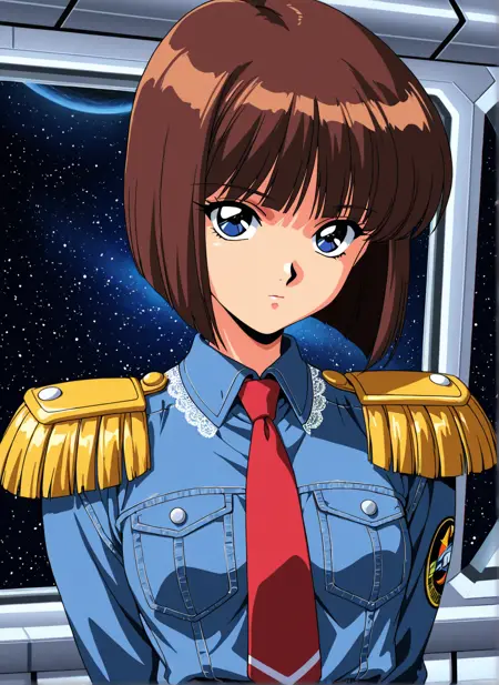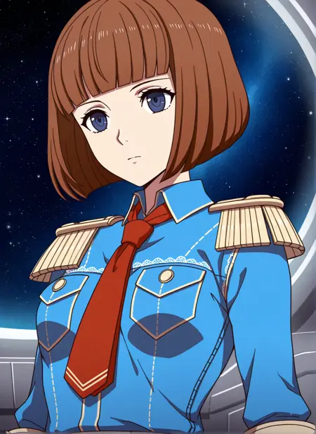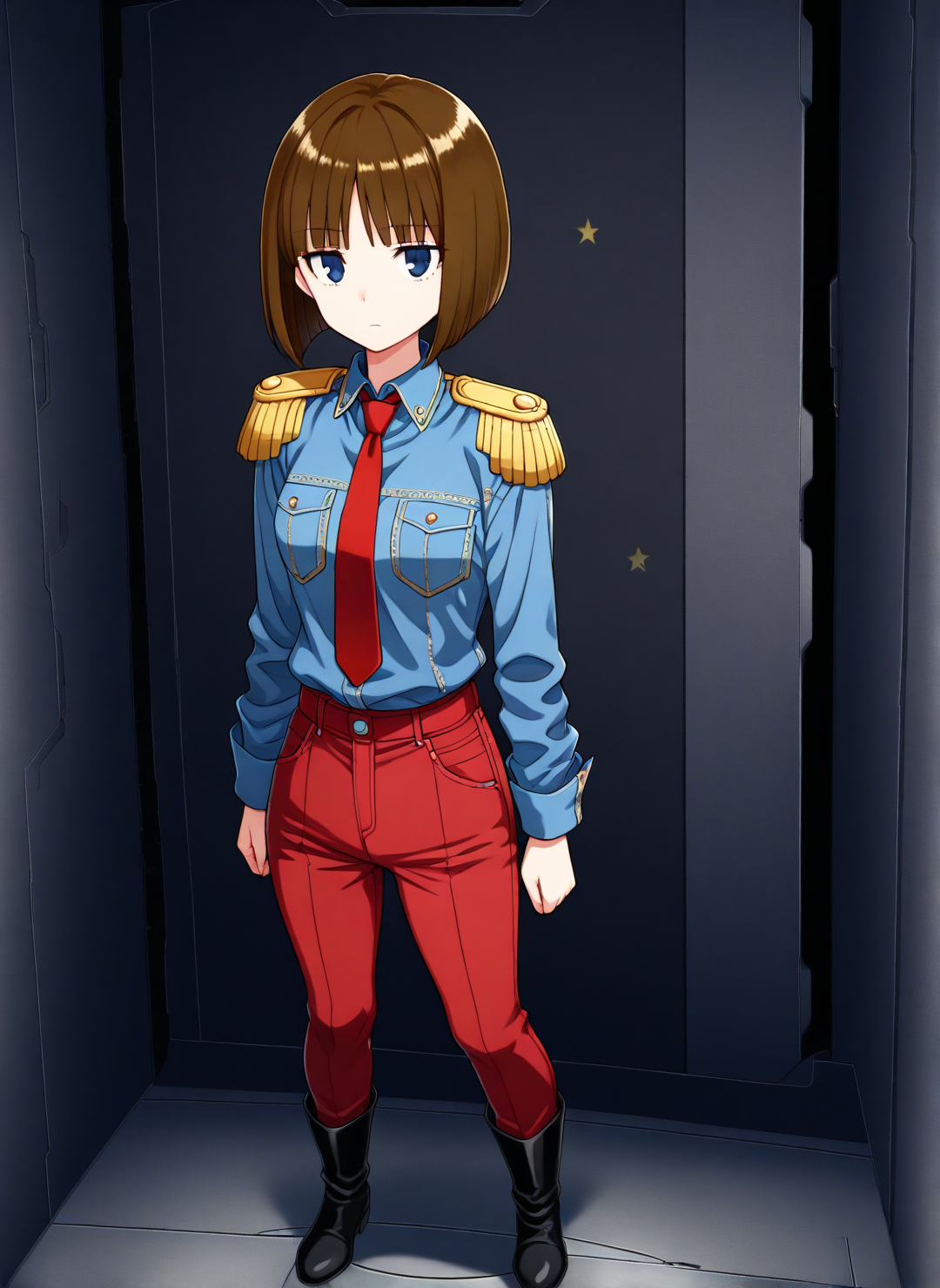 私のOCの一つで、いくつかの合成画像でのトレーニングの実験です。彼女の顔のプロンプトは「C1LAESG」、そして「青い目、茶色の髪、ボブカット」、デフォルトの衣装は「 Epaullette、青いシャツ、赤いネクタイ、赤いズボン」です。