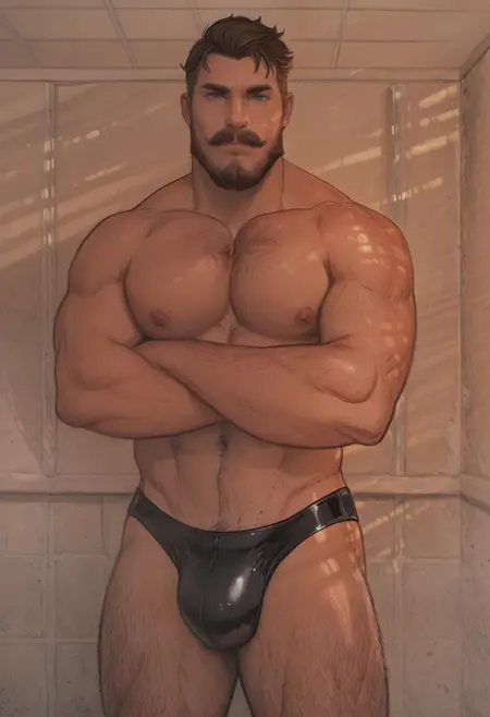 • with blue underwear, red shirt, police uniform, black speedo, white tank top, blue short pants, black short pants .