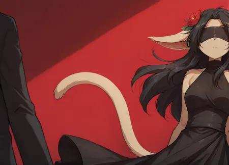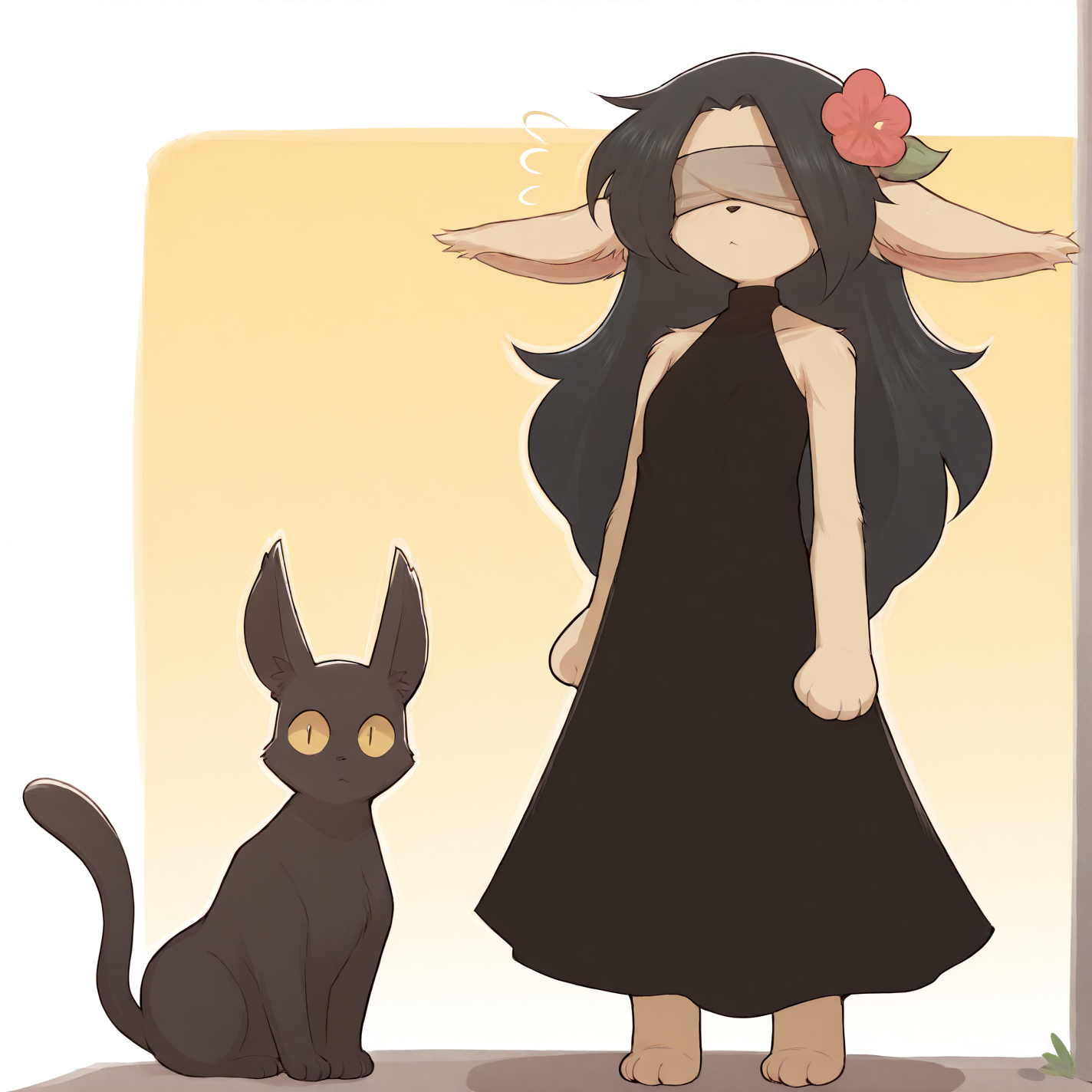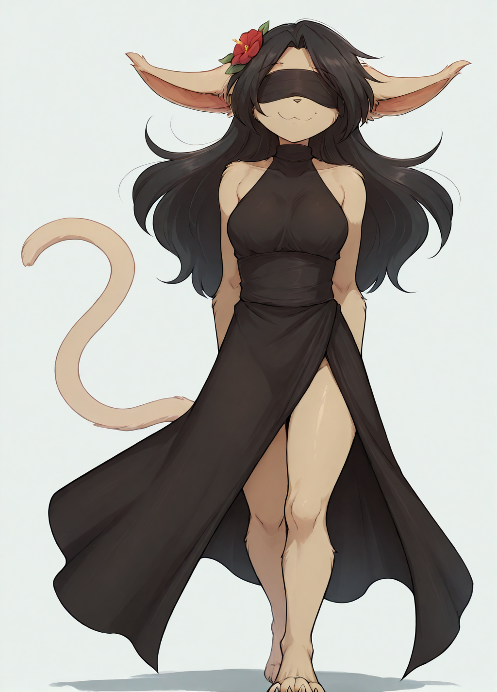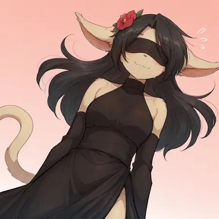 Tags to create: BSD, black dress, black hair, female,anthro, anthro female, basitin , long hair, blindfold,flower in hair, cat tail,