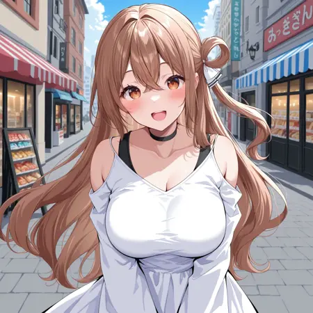 约会:yuiill,棕色眼睛,棕色头发,长发,1女孩,大胸部,头发遮住眼睛,单发圈,发带,yuidt,衬衫,连衣裙,裤子,长袖,露肩衬衫,项圈,肩部开衩,白色连衣裙,黑色项圈,黑色衬衫