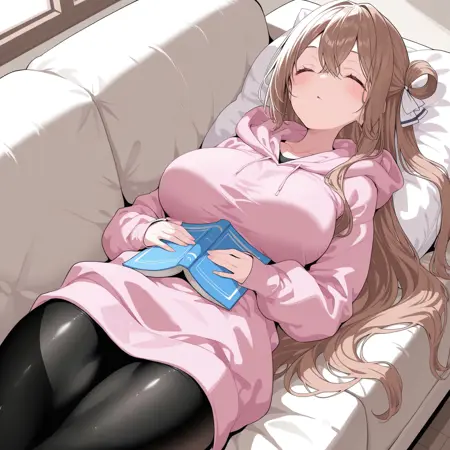 居家:yuiill,棕色眼睛,棕色头发,长发,1女孩,大胸部,头发遮住眼睛,yuisch,单发圈,发带,yuihome,连帽衫,紧身裤,粉色连帽衫,黑色紧身裤