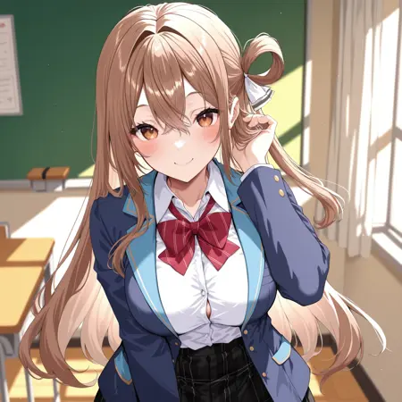 校服:yuiill,棕色眼睛,棕色头发,长发,1女孩,大胸部,头发遮住眼睛,yuisch,单发圈,发带,校服,衬衫,裙子,领结,西装外套,格子裙,夹克,浅色衬衫,长袖,蓝色外套,白色衬衫,黑色裙子,红色领结,黑色袜子