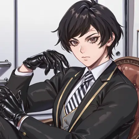 트리거 단어: 히라사카 유카, 날카로운 얼굴 특징, 단발, 검은 머리, 갈색 눈, 이마의 흉터, 넥타이, 재킷,