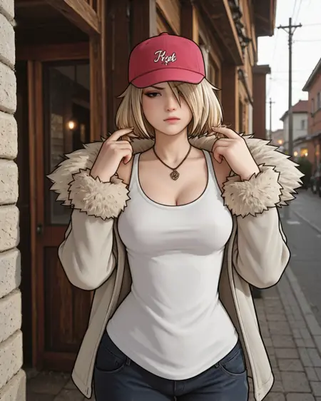 トリガー: F3mSh4k3, 1girl, ブロンドヘア, 短髪, 髪で目を隠している, 黒い目, ピンクの帽子, ネックレス, 白いタンクトップ, ジャケット, ファーのトリム, ジーンズ, パンツ