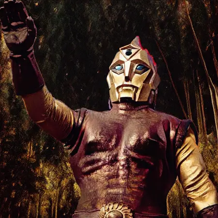 Spectreman, giant superhero, cyborg, gold hard mask, shining green cut hemisphere on forehead, gold bodysuit, dark brown unitard leather armor, sun design buckle, dark brown gloves, dark brown boots