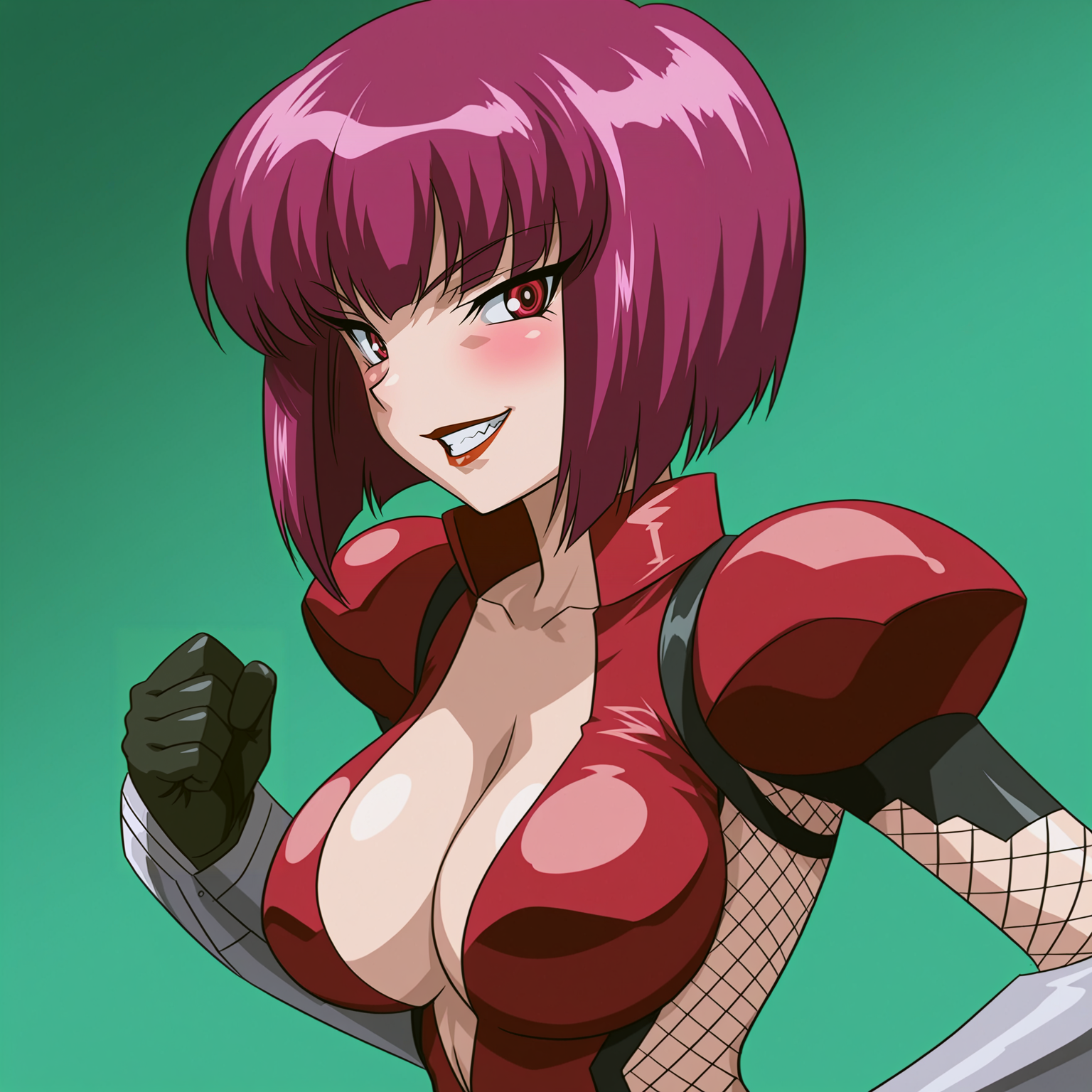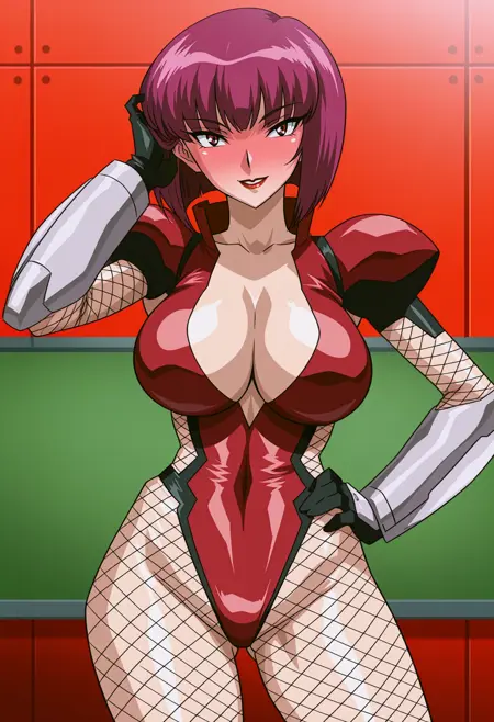 oborosuit, 빨간 바디수트, 갑옷 바디수트, 고컷 레오타드, 가슴 홈, 깊은 V넥, 갑옷 어깨, 팔뚝 보호대, 피쉬넷 바디수트, 피쉬넷 팔, 피쉬넷 다리, 허벅지 갑옷, 종아리 갑옷, 하이힐, 장갑,