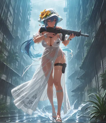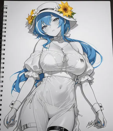 DPmornin、青い目、青い髪、多色の髪、白い髪、ストライプ模様の髪、長い髪、ポニーテール、目の間の髪、大きな胸、胸元、裸の肩、シルバーのネックレス、白いチョーカー、白い日よけ帽子、黄色い帽子の花、Vネック、白いロングドレス、透け感のあるドレス、サイドスリット、ハーネック、白いビキニ、服の下に透けるビキニ、フリルのショートスリーブ、白い手首カフス、青いネイル、白いビキニボトム、黒い太ももストラップ、白い太ももレッグウォーマー、白いサンダル、