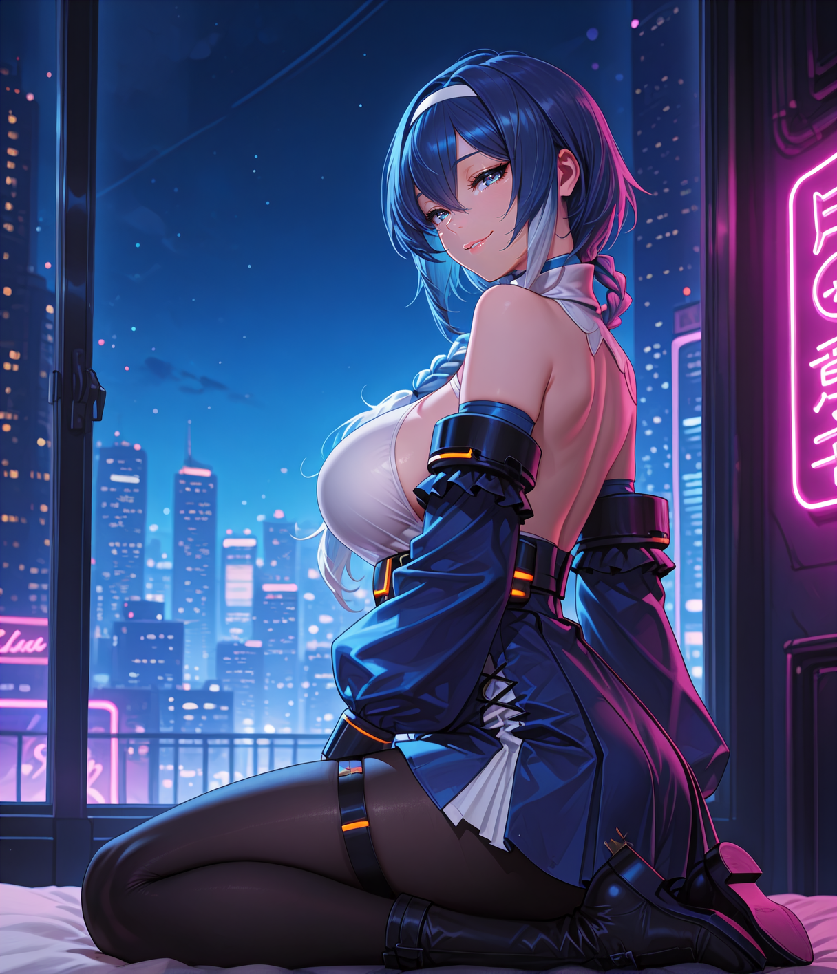 DPbase、青い目、多色の髪、青い髪、白い髪の片側編み込み、白い髪留め、長い髪、目の間の髪、大きな胸、サイドブリーフ、白いシャツ、タートルネック、裸の肩、青い袖、レーストリム、取り外し可能な袖、ハイウエストスカート、青いスカート、黒いタイツ、太ももストラップ、黒いブーツ、