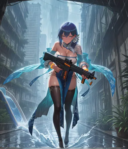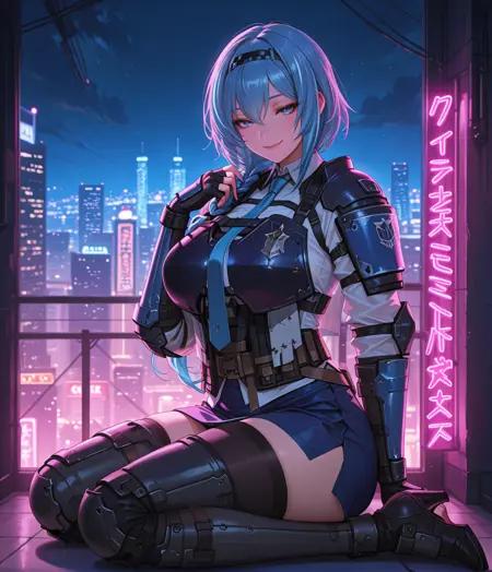 DPneur、青い目、青い髪、ストライプ模様の髪、長い髪、目の間の髪、片側編み込み、黒い髪留め、大きな胸、青いネクタイ、白いシャツ、アーマーグローブ、指先のない黒いグローブ、軍服、ボディアーマー、青いアーマー、茶色のベルト、短い青いスカート、非対称な脚の装備、黒い太ももハイ、すね当て、ハイヒールブーツ、アーマードブーツ、