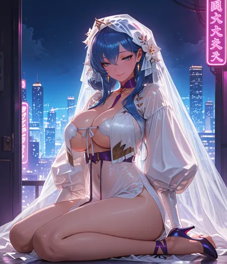 DPlan、青い目、青い髪、多色の髪、白い髪、長い髪、花の髪飾り、片方の肩にかかる髪、目の間の髪、大きな胸、胸元、お札、ブレスレット、青いショール、片方の肩を露出、透け感、取り外し可能な袖、サイドスリット、ツートーンドレス、青いドレス、白いドレス、白いサイドタイポニー、非対称な服、黒い太ももハイ、黒いハイヒール、