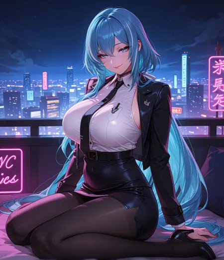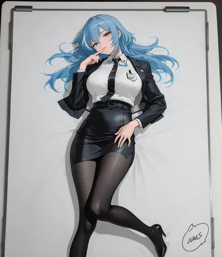 DPmiss、青い目、青い髪、多色の髪、白い髪、ストライプ模様の髪、長い髪、目の間の髪、大きな胸、黒いジャケット、黒いネクタイ、白いシャツ、長袖、ノースリーブシャツ、黒いベルト、黒い-pencilスカート、黒いタイツ、黒いハイヒール、
