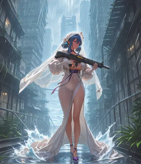 DPWed、青い目、青い髪、長い髪、髪の結び目、目の間の髪、白い髪の花、大きな胸、胸元、紫のネクタイ、アンダーブリーフ、白いウェディングドレス、サイドスリット、ブライダルベール、長袖、フリル袖、紫のチョーカー、ゴールドの耳飾り、開いた服、白いブライダルガントレット、おへそをカバー、紫のハイヒール、