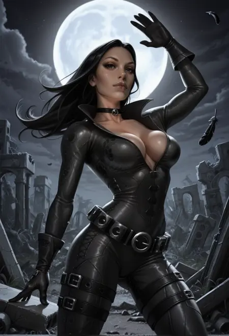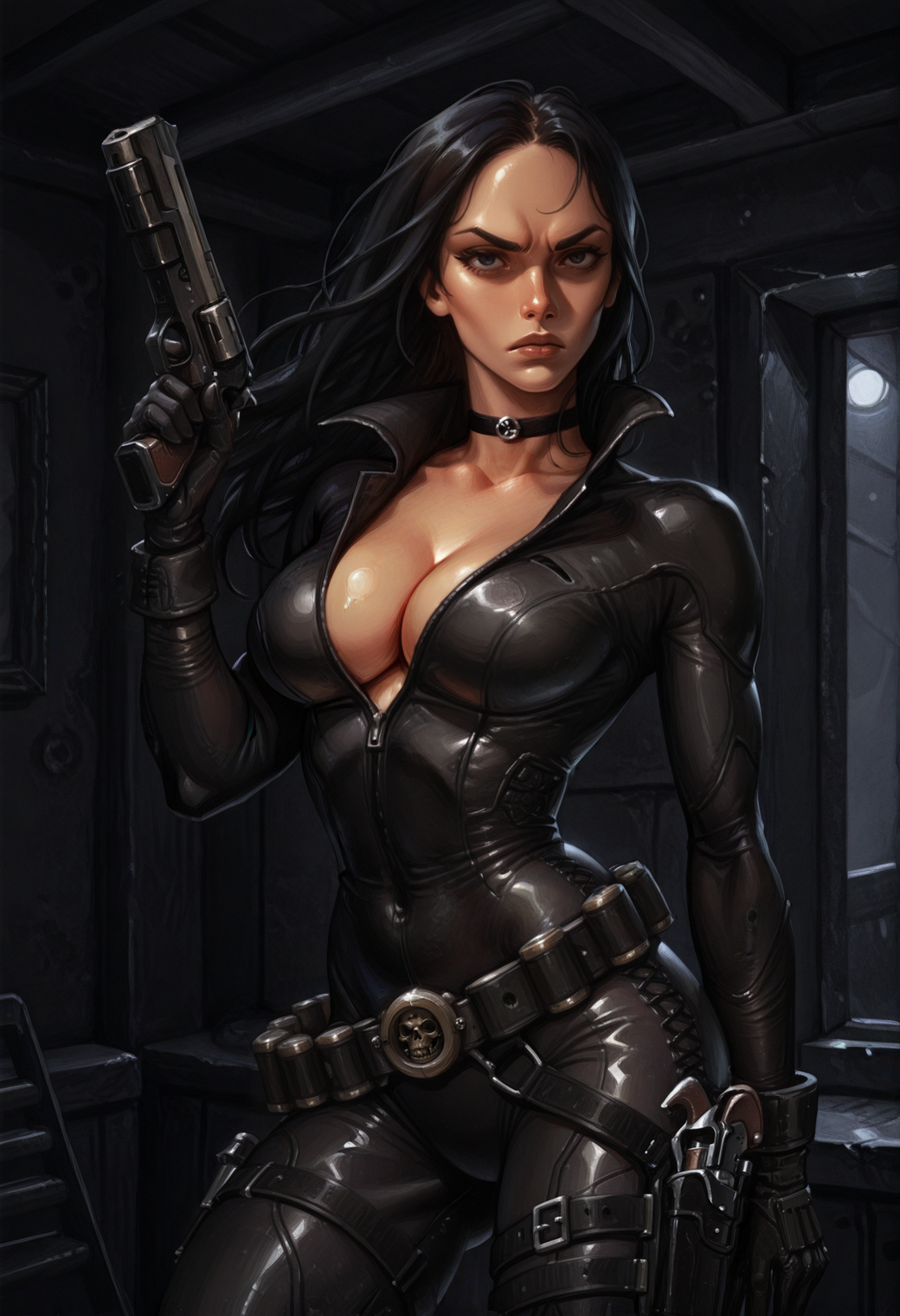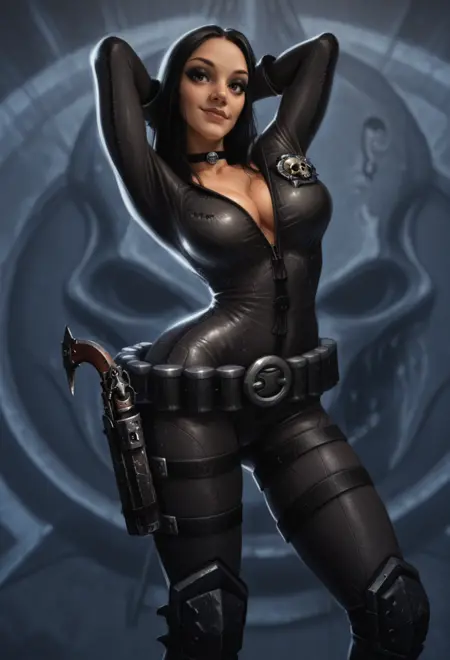 主要なトリガー語 - taladw、ロングヘア、黒髪、黒首輪、黒ボディスーツ、胸元、バッジ、黒手袋、ベルト、