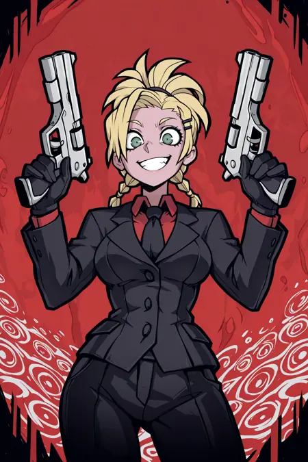 トリガー:リックゥ、金髪、短髪、高いポニーテール、短いポニーテール、ツインブレード、羽の髪飾り、ヘアクリップ、緑の目、首にゴーグル、肩を露出、オレンジのノースリーブのタートルネック、青いマント、緑の腕輪、片手の手袋、片方の肘パッド、片方の指なし手袋、緩いベルト、ベルト、緑のショートパンツ、太ももホルスター、ブーツ