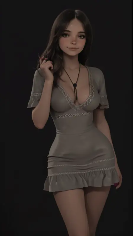 gray felt dress, short sleeves, white lace trim, white lace midriff strip, white lace sleeve strips, double sleeve cuffs, bolo tie, plunge neckline, cleavage, white lace pelvis strips, multiple fold pelvis strip, short dress, frilly hem