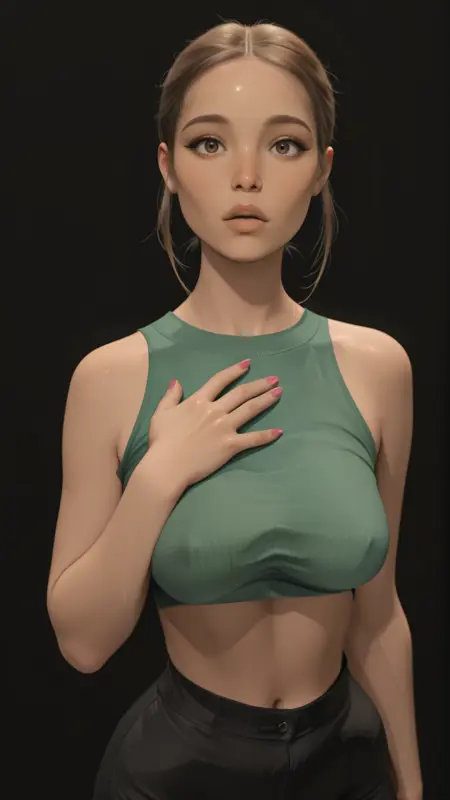 ariana_lvsb_flashback, dark brown eyes, light brown hair, hair pulled back, wispy sidelocks, lips, glossy lips, eyebrows, eyeliner, medium breasts, pink fingernails, green cropped top, sleeveless, midriff, brown slacks