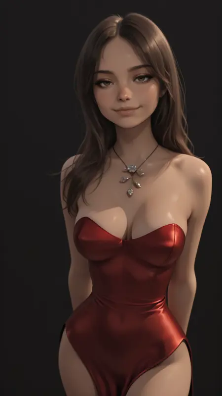 string necklace, silver flower pendant, silver tendrils on flower pendant, red dress, strapless, cleavage, slim-fit dress, very high side slits on dress, long dress