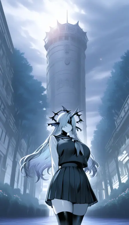- leviathan (wuthering waves),leviathan (default),苍白皮肤,灰色皮肤,遮住眼睛,眼罩,灰发,多色头发,长发,巨乳,角,光环,长角,头部鳍,荆棘冠,厌恶,黑泪,连衣裙,裙子,脚链,臂环,盔甲,手套,暴露服装,护腕,短袍,