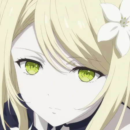 긴 금발 머리, 측면으로 넘긴 앞머리, 녹색 눈, 희끄무레한 피부,