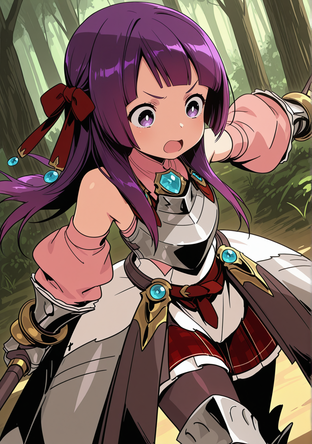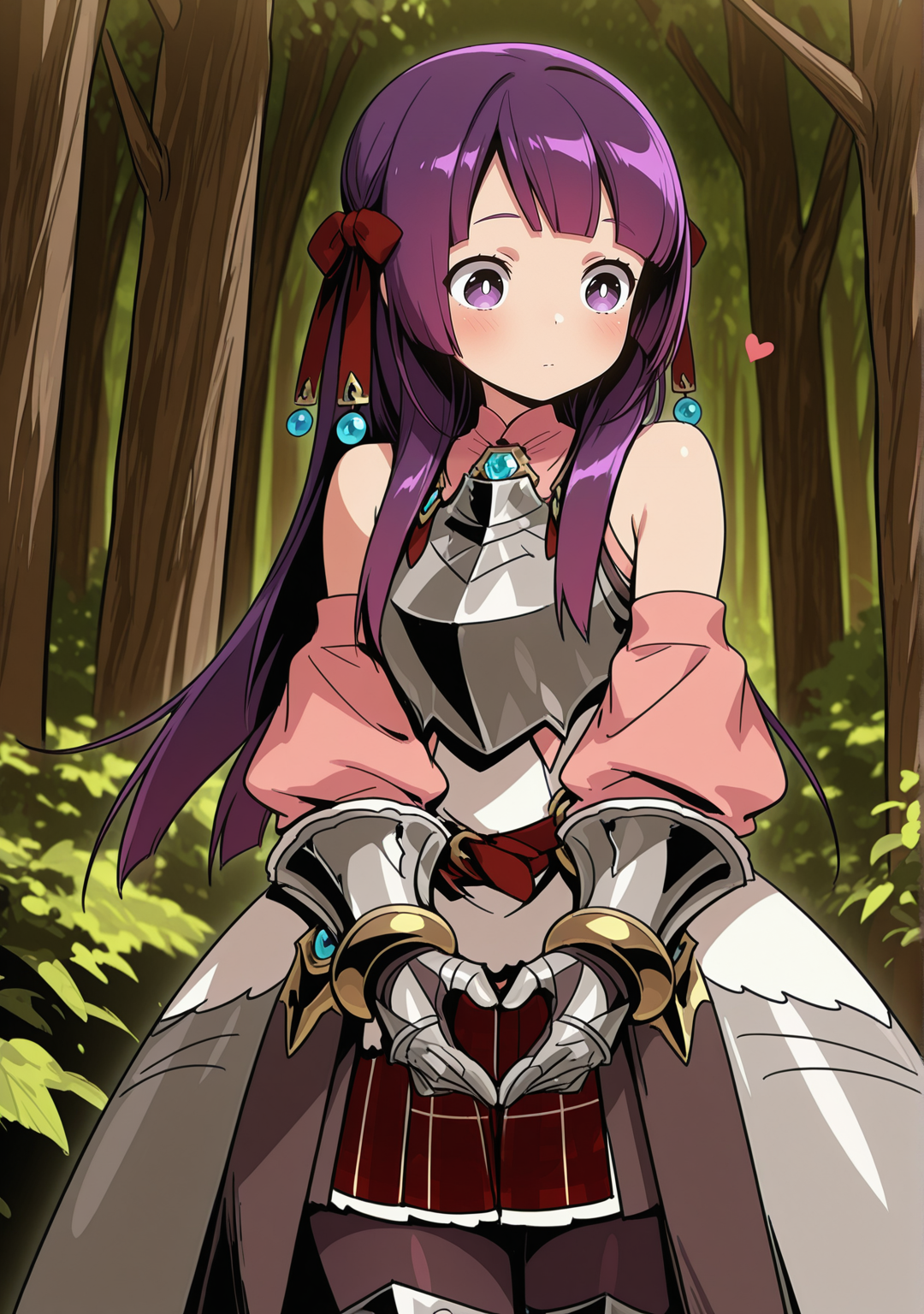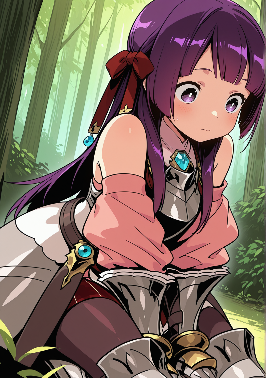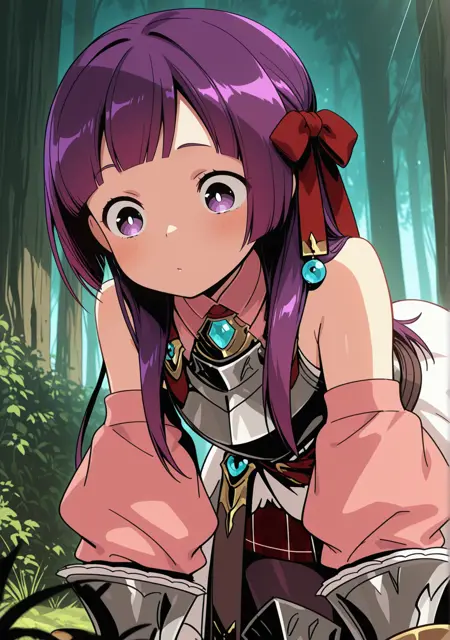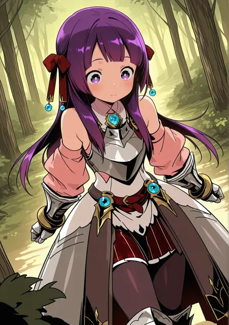 推奨:パープルの髪、パープルの目、アーマー、アーマードブーツ、アーマードドレス、裸の肩、ベルト、ブラントな前髪、ブーツ、胸当て、明るい瞳、外れ袖、ガントレット、宝石、手袋、髪のリボン、髪の飾り、髪のリボン、ジュエリー、ロングヘア、パンティーホース、ピンクのシャツ、チェックのスカート、プリーツスカート、ふわふわ袖、赤いリボン、赤いリボン、赤いスカート、白いドレス、白い瞳、