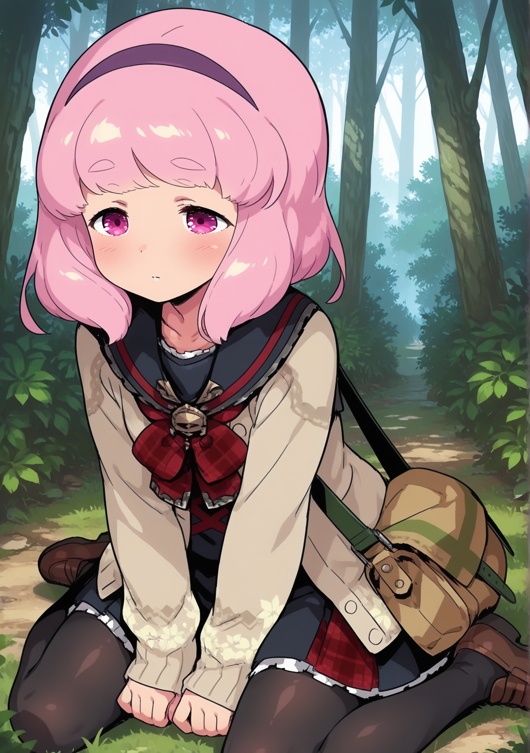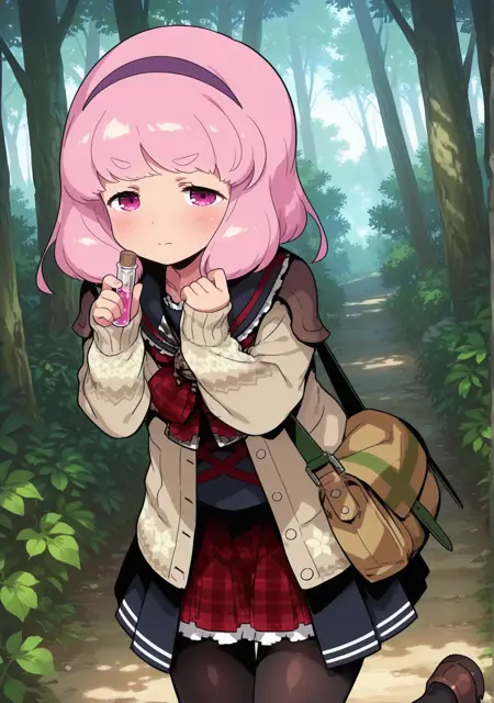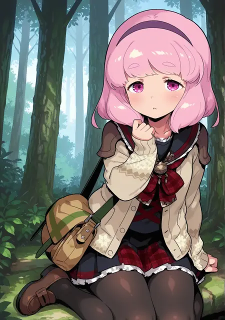 推荐:粉发,粉眼,中长发,黑色丝袜,黑色短裙,黑色水手服,棕色开衫,荷叶边裙,紫色发带,迷你裙,长袖,红色领结,敞开式开衫,格子裙,百褶裙,格子蝴蝶结,红色裙子,黑色水手领,短发,斜挎包,裙子,袖子超过手腕,浓眉,棕色鞋子,乐福鞋,