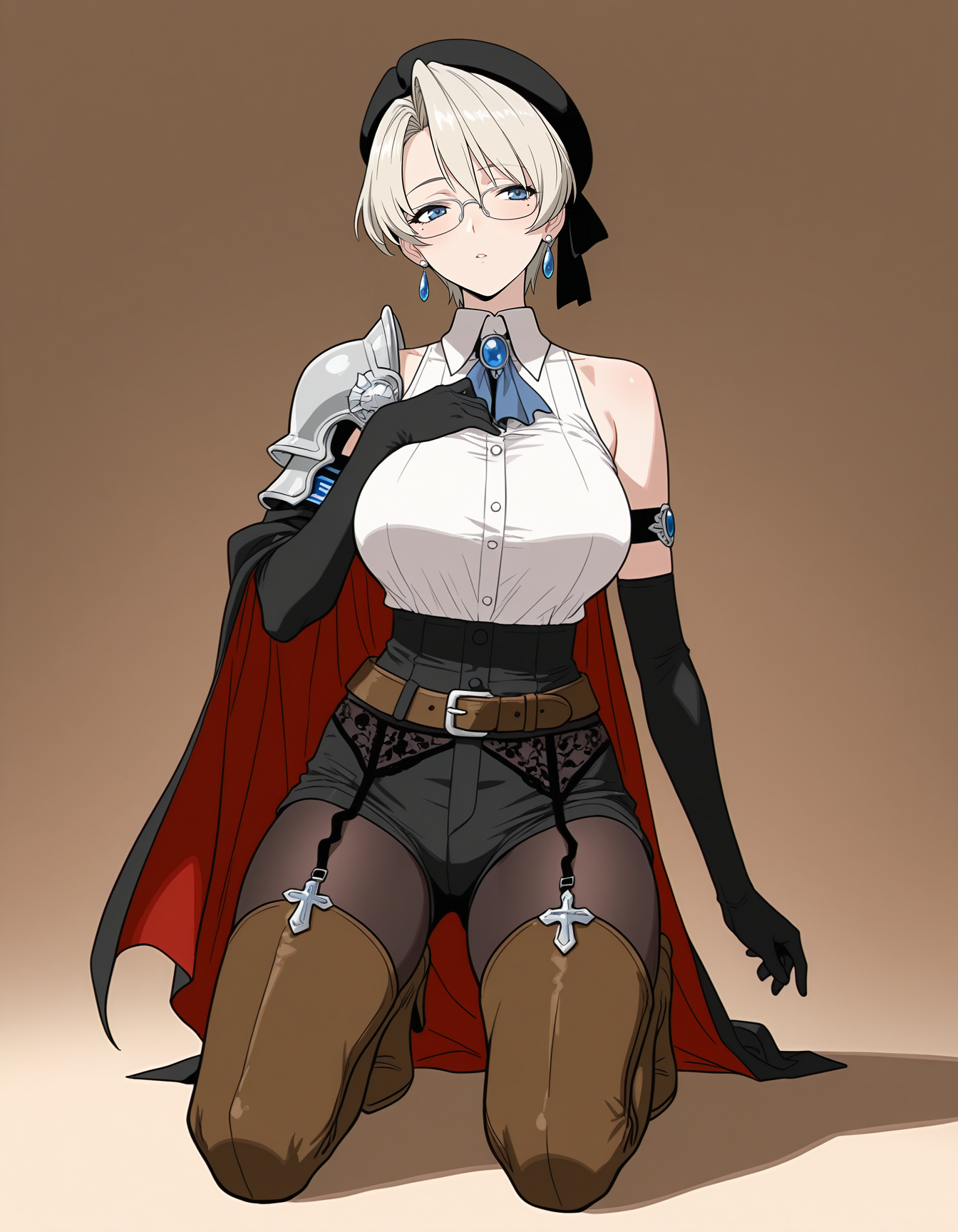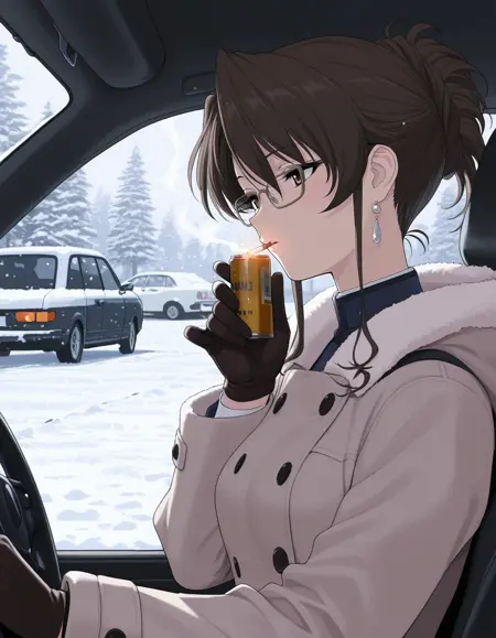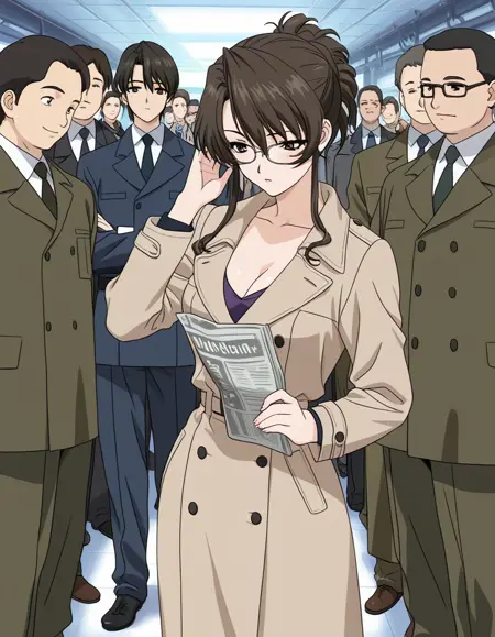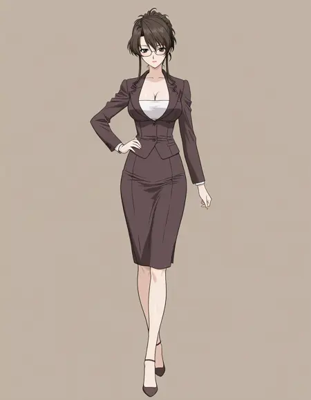 mai_himegoto,mai_hmgt_misaki,mature_female,hair_up,brown_hair,glasses,brown_eyes,lipstick,earrings,long_coat,open_clothes,purple_shirt,black_pencil_skirt,brown_high_heels