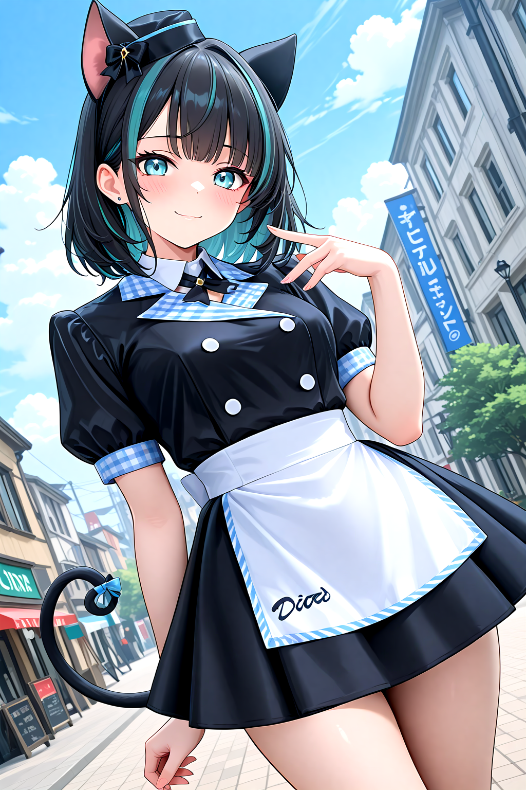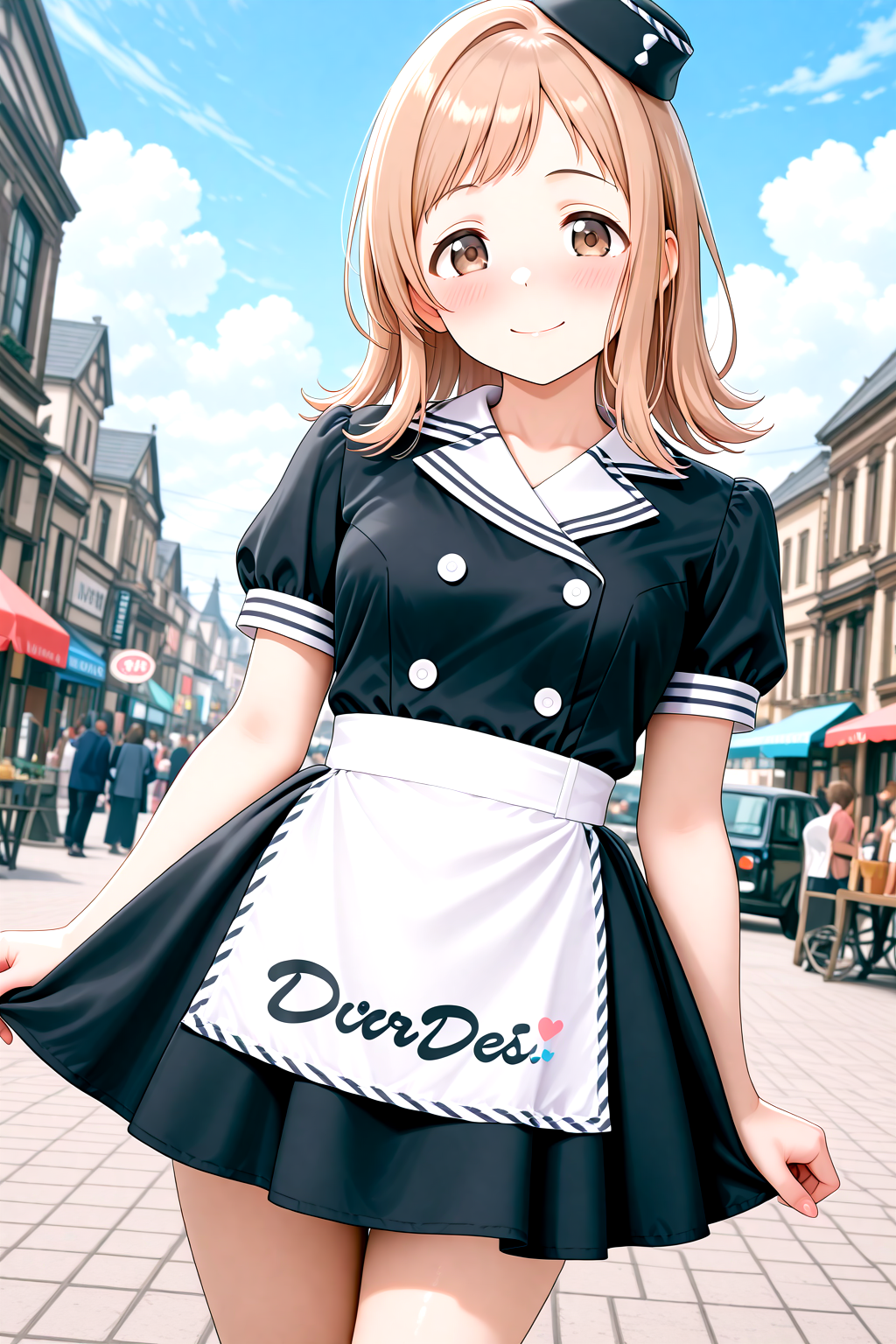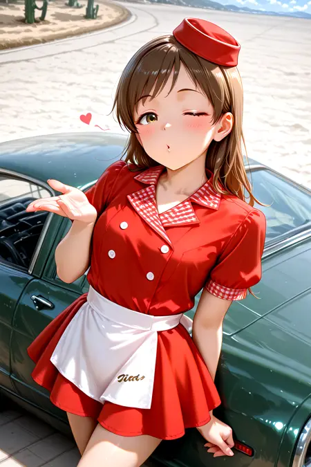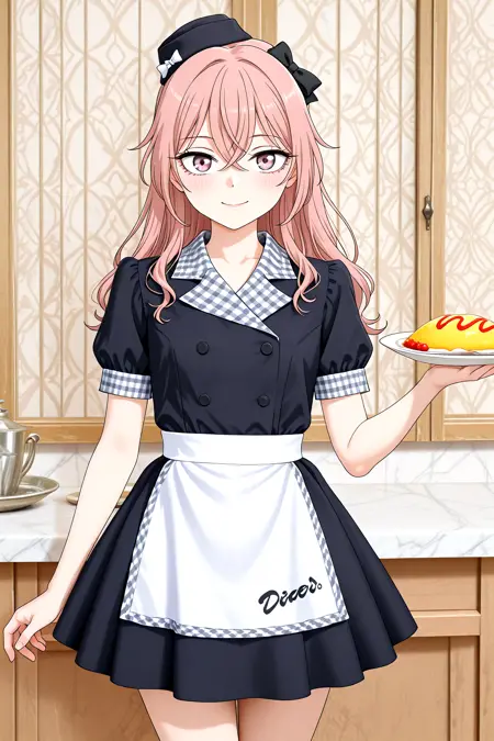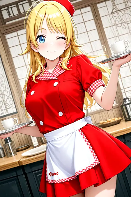 Wait1ress_Outfit, dress, short dress, headwear, puffy short sleeves, waitress, waist apron, white apron, white socks, shoes