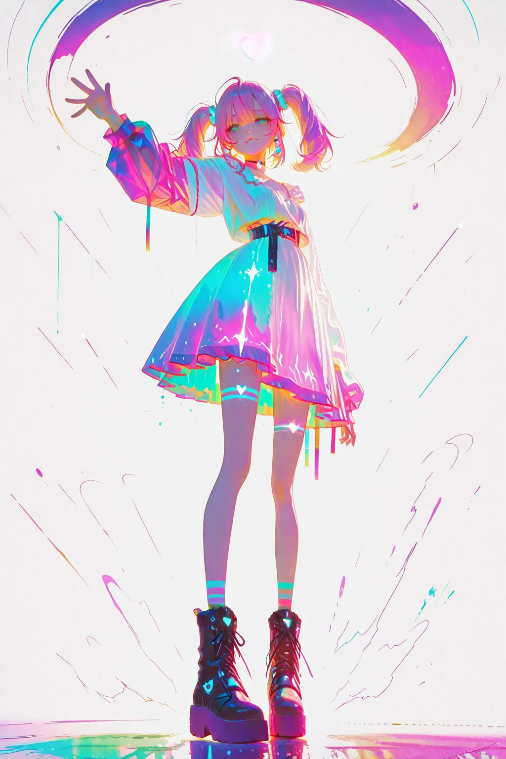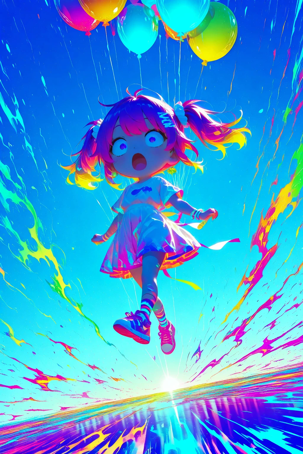 • Opetional Information: A vibrant anime-style. The image has an extremely saturated, psychedelic color scheme with intense neon colors .Heavy chromatic aberration and RGB split effects create a trippy, glitch art aesthetic. The overall style combines anime illustration with extreme color grading, thermal imaging effects, and digital glitch aesthetics. High contrast between shadows and highlights creates a dramatic, surreal atmosphere with an otherworldly,dreamlike quality. (鮮やかなアニメ調のイメージを演出。強烈なネオンカラーを用いた極めて彩度の高いサイケデリックな配色が特徴。重度の色収差とRGB分離効果が生み出すトリッピーなグリッチアート美学。全体的なスタイルは、アニメイラストレーションに極端なカラーグレーディング、サーマルイメージング効果、デジタルグリッチ美学を融合させたもの。影とハイライトのハイコントラストが、非現実的で夢のような質感を帯びた、劇的でシュールな雰囲気を創出)