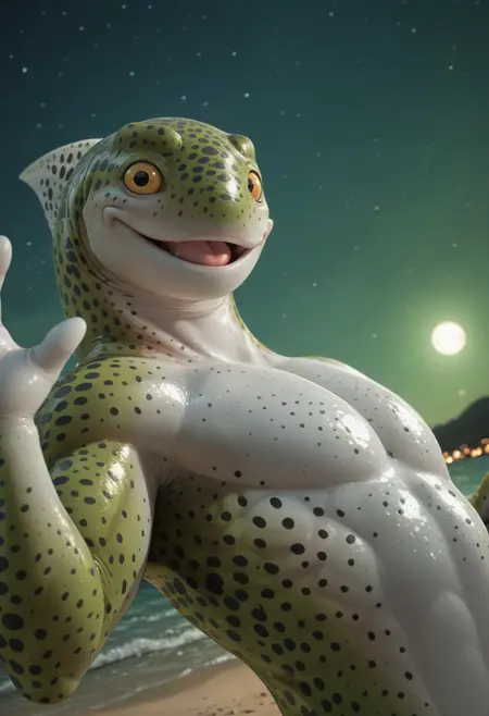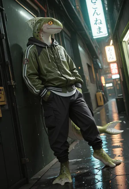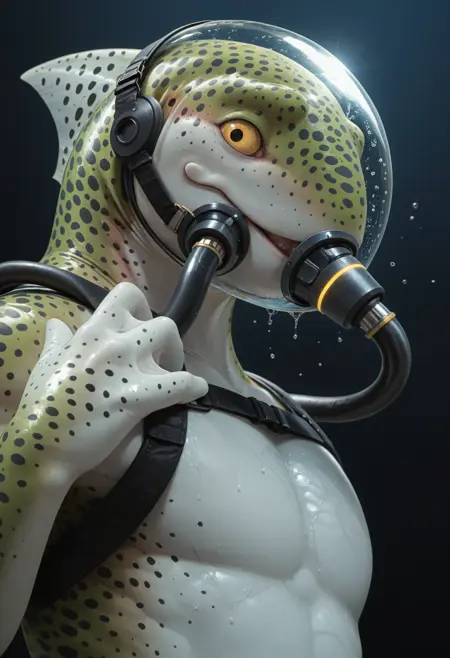 📝Rainbowtrout は、アーティスト Greenwing によるオリジナルキャラクターです。スレンダーで筋肉質な体を持ち、緑とピンクの色合いと肌に広がる黒い斑点を持つ人間型のレインボートラウト。頭にはヒレがあり、大きな黄色い目には特徴的な光沢があります。彼のデザインは、魚の特徴と陸生生物の解剖学的構造を融合させています。