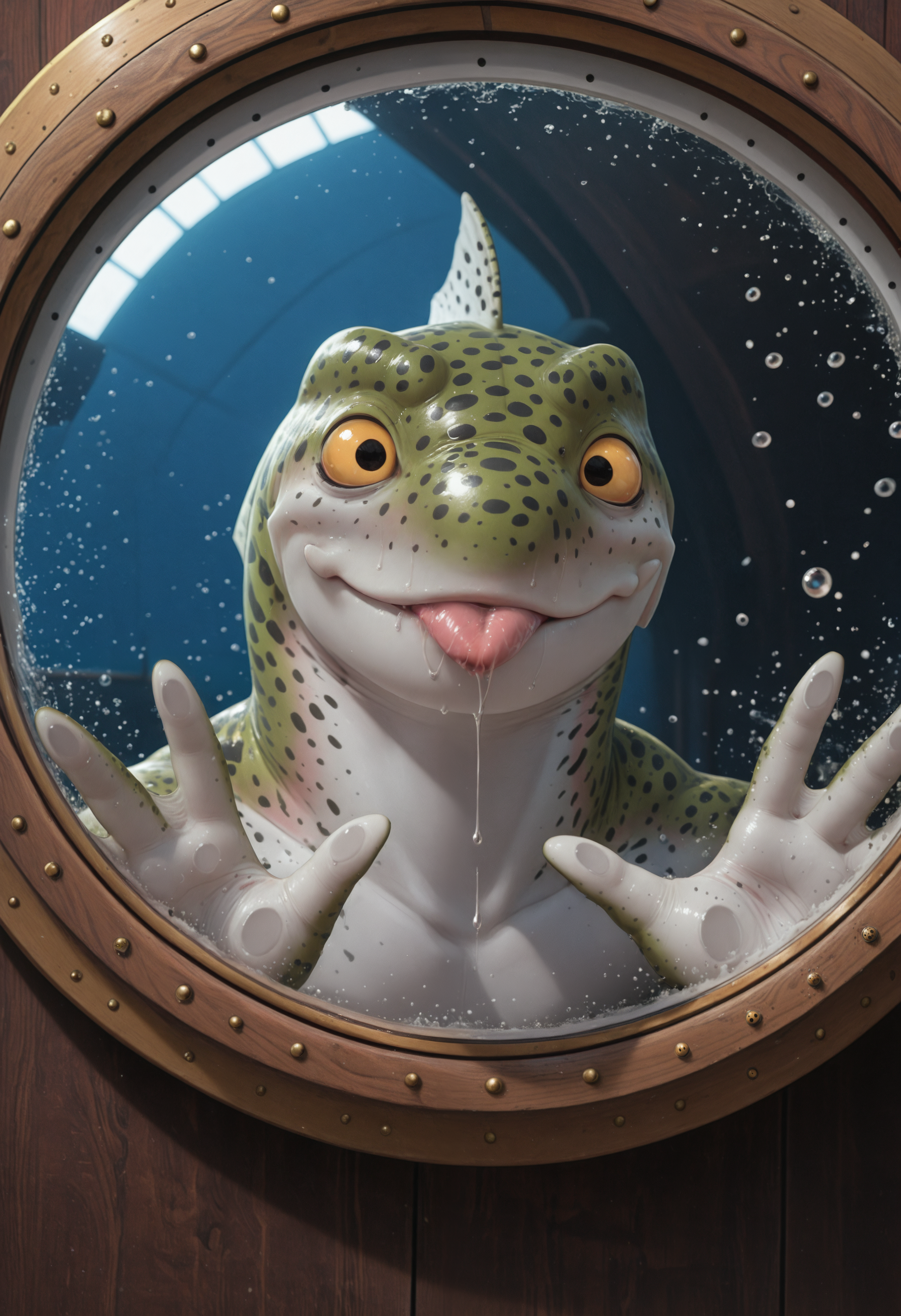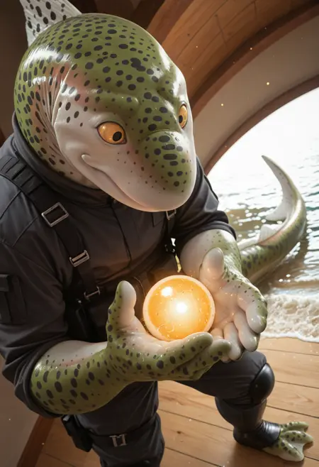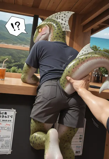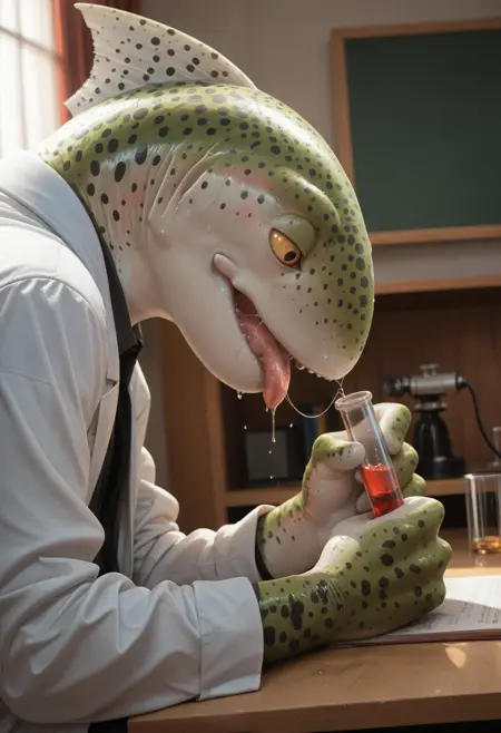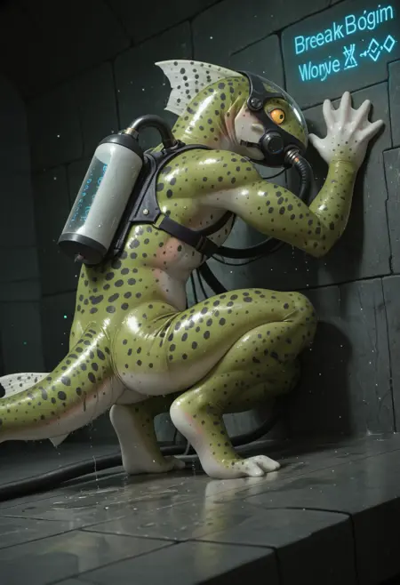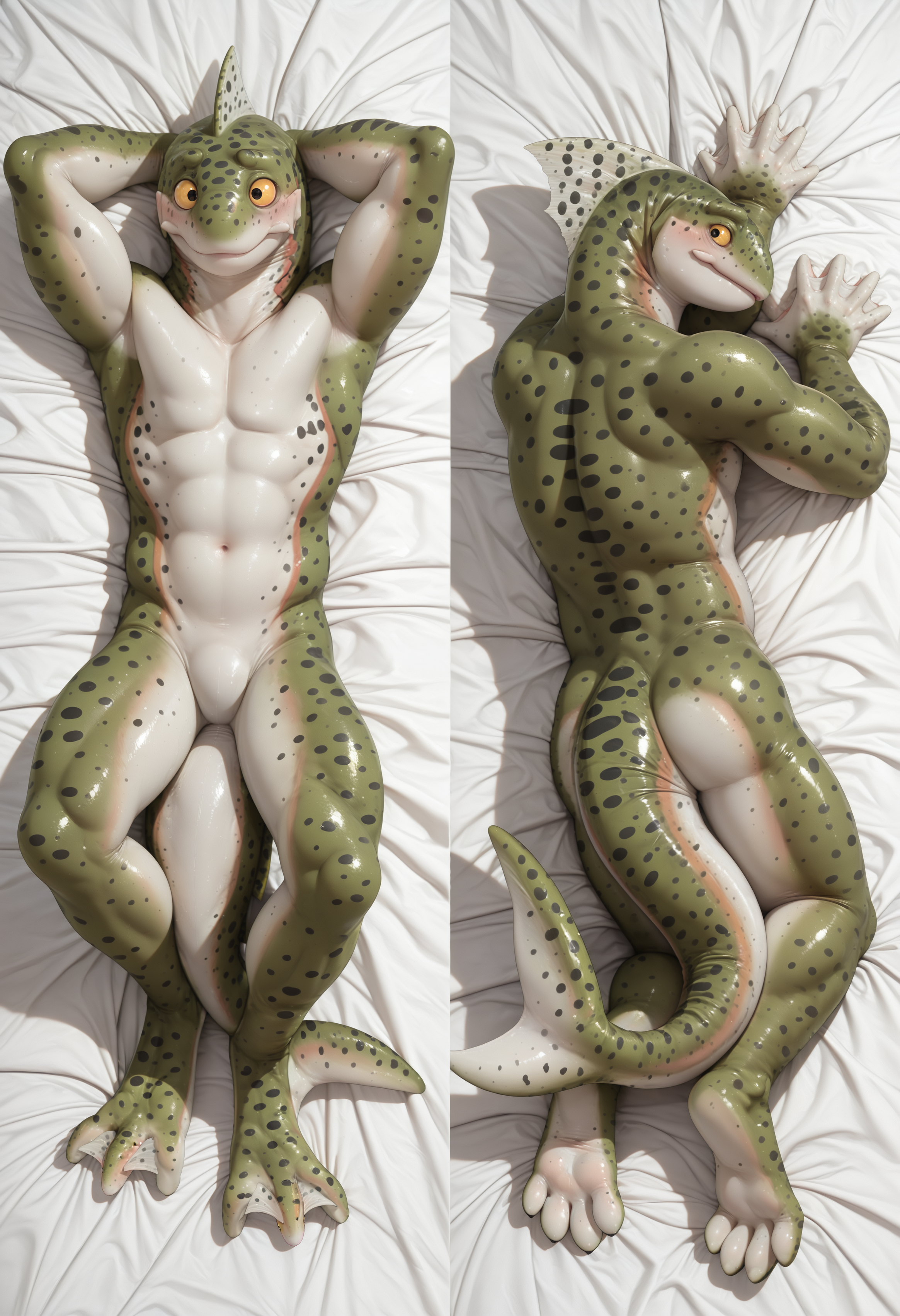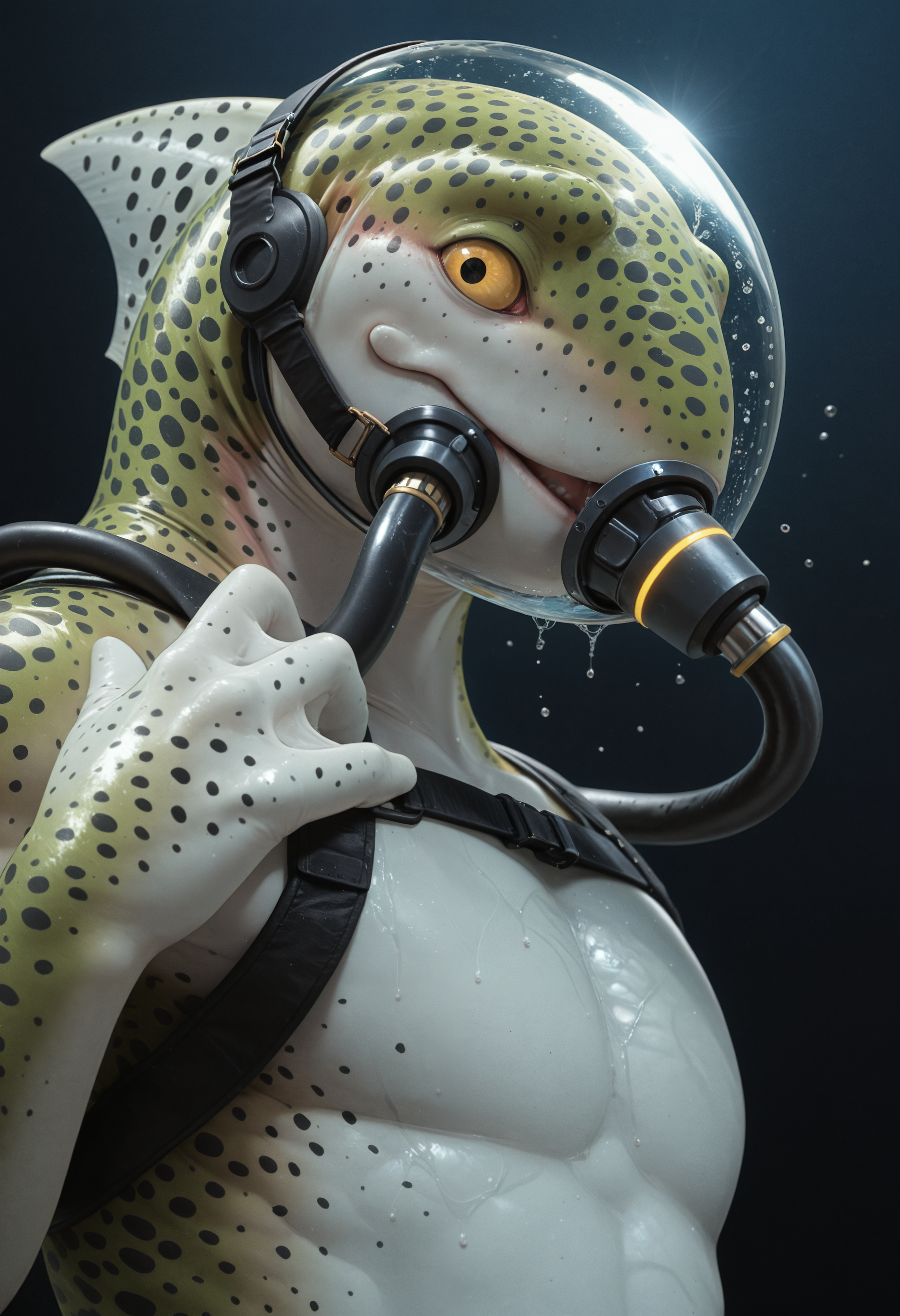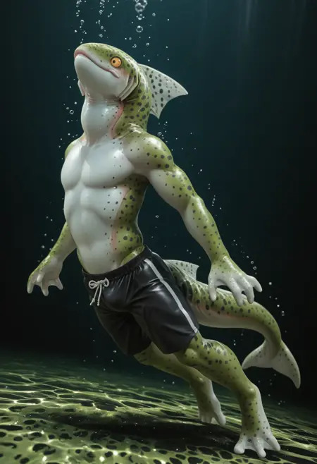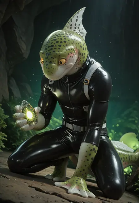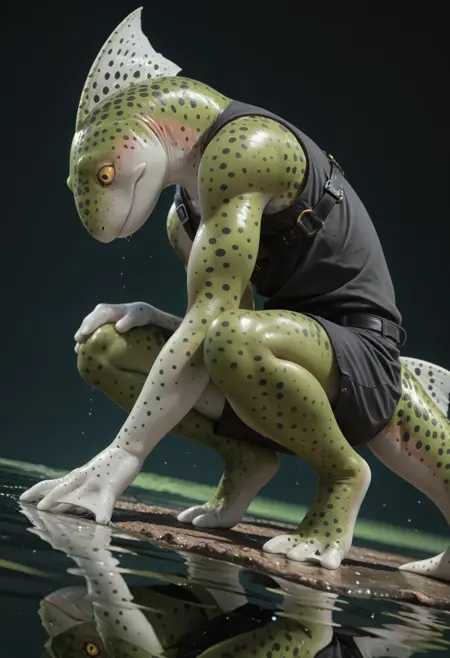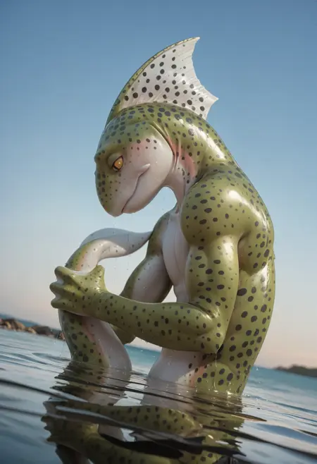 📝 Rainbowtrout — оригинальный персонаж художника Greenwing. Антропоморфная радужная форель с гибким мускулистым телом, зелёно-розовой окраской и тёмными пятнами по коже. На голове — плавник, глаза крупные, жёлтые, с выразительным блеском. В его облике сочетаются природные черты рыбы и анатомия наземного существа.