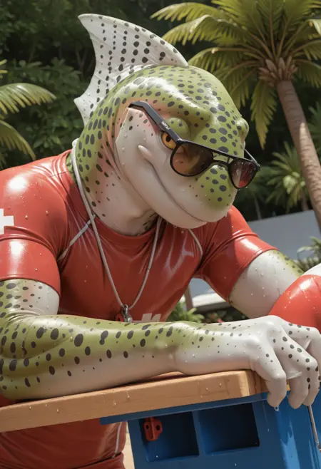 📝 Rainbowtrout 是艺术家 Greenwing 原创的角色。这是一只拟人化的彩虹鳟鱼,拥有修长健壮的身躯,皮肤呈绿粉配色,并布有深色斑点。头顶长有鳍片,双目硕大呈黄色,目光炯炯有神。其设计融合了鱼类特征与陆地生物的解剖结构。