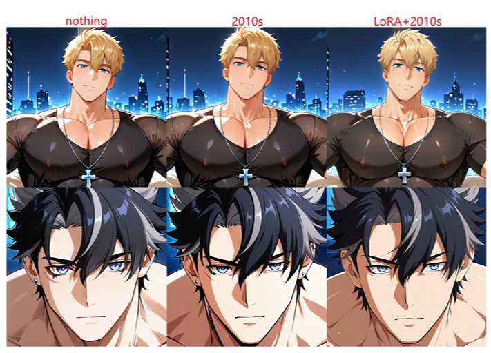 如果你发现强度过高影响了你的图片,或其它LoRA的强度干扰了风格,添加‘2010s’或‘2010s (style)’,可以更轻松、更有效地控制艺术风格。